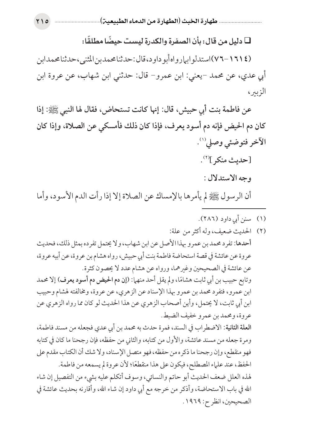 وتابع حبيب بن أبي ثابت هشامًا، ولم يقل أحد منهما: (إن دم الحيض دم أسود يعرف) إلا محمد ابن عمرو، فتفرد محمد بن عمرو بهذا الإسناد عن الزهري، عن عروة، ومخالفته لهشام وحبيب ابن أبي ثابت، لا يحتمل، وأين أصحاب الزهري عن هذا الحديث لو كان مما رواه الزهري عن عروة، ومحمد بن عمرو خفيف الضبط.