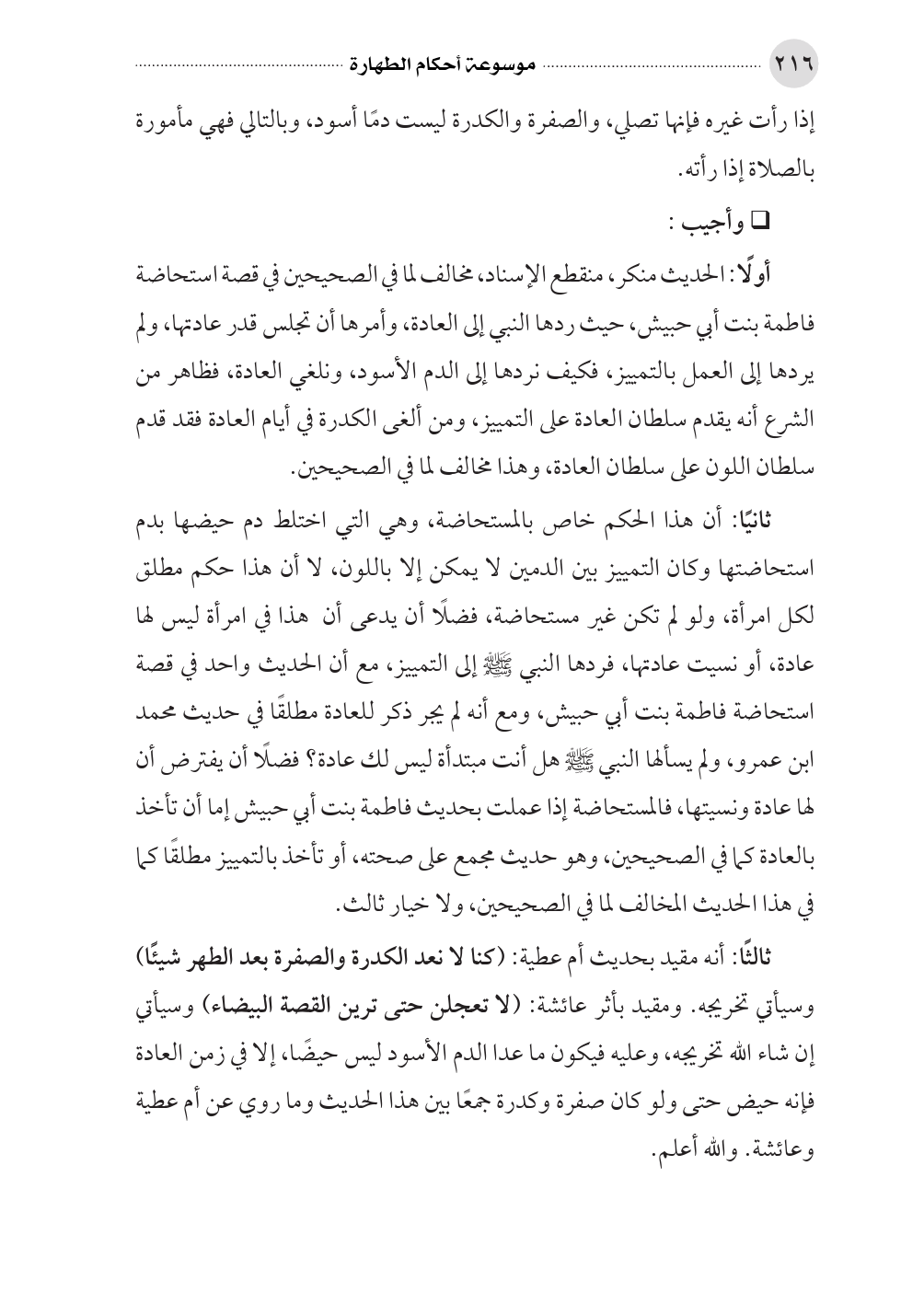 ثانيًا: أن هذا الحكم خاص بالمستحاضة، وهي التي اختلط دم حيضها بدم استحاضتها وكان التمييز بين الدمين لا يمكن إلا باللون، لا أن هذا حكم مطلق لكل امرأة، ولو لم تكن غير مستحاضة، فضلًا أن يدعى أن هذا في امرأة ليس لها عادة، أو نسيت عادتها، فردها النبي صلى الله عليه وسلم إلى التمييز، مع أن الحديث واحد في قصة استحاضة فاطمة بنت أبي حبيش، ومع أنه لم يجر ذكر للعادة مطلقًا في حديث محمد ابن عمرو، ولم يسألها النبي صلى الله عليه وسلم هل أنت مبتدأة ليس لك عادة؟ فضلًا أن يفترض أن لها عادة ونسيتها، فالمستحاضة إذا عملت بحديث فاطمة بنت أبي حبيش إما أن تأخذ بالعادة كما في الصحيحين، وهو حديث مجمع على صحته، أو تأخذ بالتمييز مطلقًا كما في هذا الحديث المخالف لما في الصحيحين، ولا خيار ثالث.
