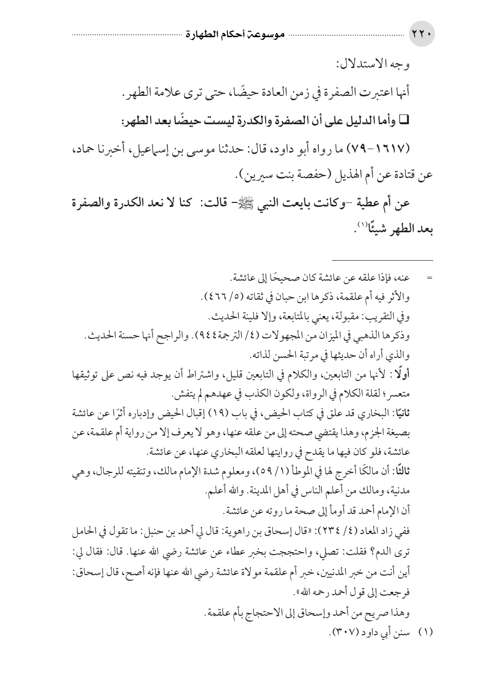 عن أم عطية -وكانت بايعت النبي صلى الله عليه وسلم- قالت: كنا لا نعد الكدرة والصفرة بعد الطهر شيئًا (¬١).