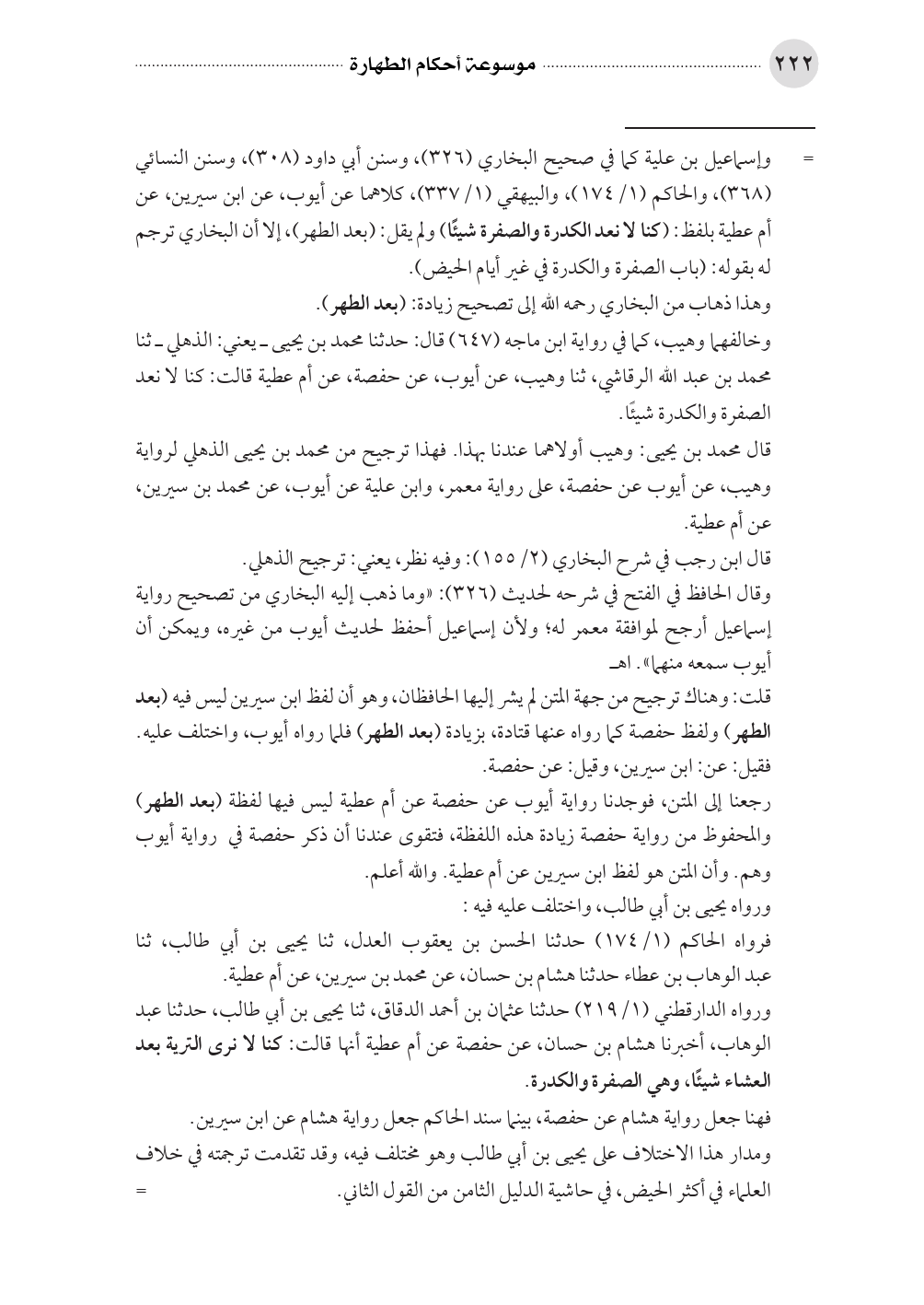 أم عطية بلفظ: (كنا لا نعد الكدرة والصفرة شيئًا) ولم يقل: (بعد الطهر)، إلا أن البخاري ترجم له بقوله: (باب الصفرة والكدرة في غير أيام الحيض).