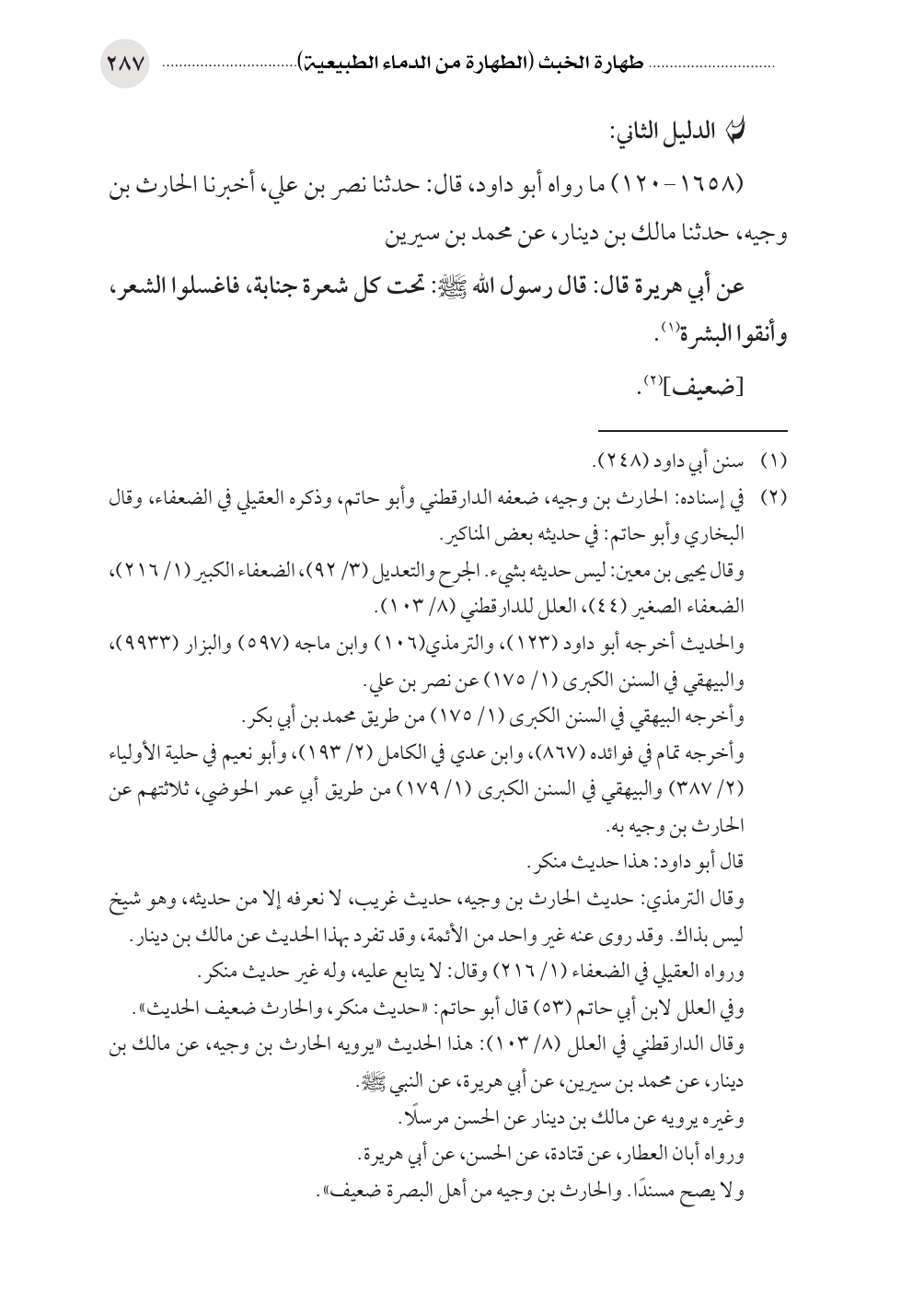 (١٦٥٨ - ١٢٠) ما رواه أبو داود، قال: حدثنا نصر بن علي، أخبرنا الحارث بن وجيه، حدثنا مالك بن دينار، عن محمد بن سيرين