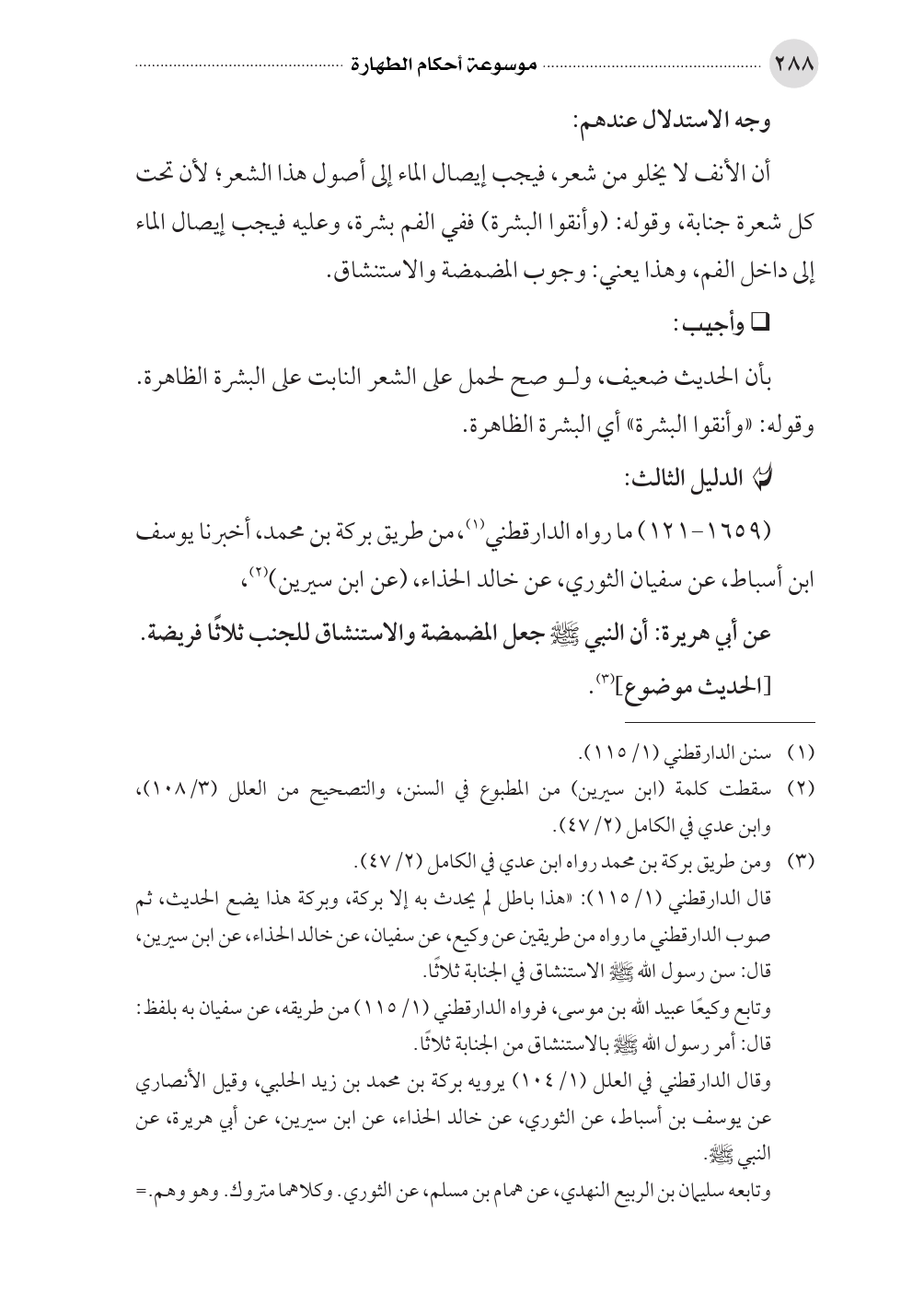 قال الدارقطني (١/ ١١٥): «هذا باطل لم يحدث به إلا بركة، وبركة هذا يضع الحديث، ثم صوب الدارقطني ما رواه من طريقين عن وكيع، عن سفيان، عن خالد الحذاء، عن ابن سيرين، قال: سن رسول الله صلى الله عليه وسلم الاستنشاق في الجنابة ثلاثًا.