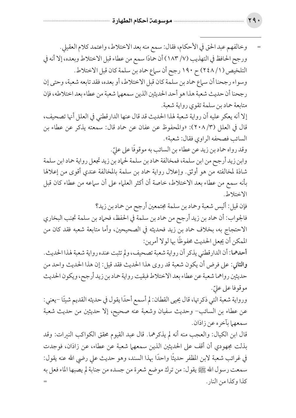 وابن زيد أرجح من ابن سلمة، فمخالفة حماد بن سلمة لحماد بن زيد تجعل رواية حماد ابن سلمة شاذة لمخالفته من هو أوثق. وإعلال رواية حماد بن سلمة بالمخالفة عندي أقوى من إعلالها بأنه سمع من عطاء بعد الاختلاط، خاصة أن أكثر العلماء على أن سماعه من عطاء كان قبل الاختلاط.