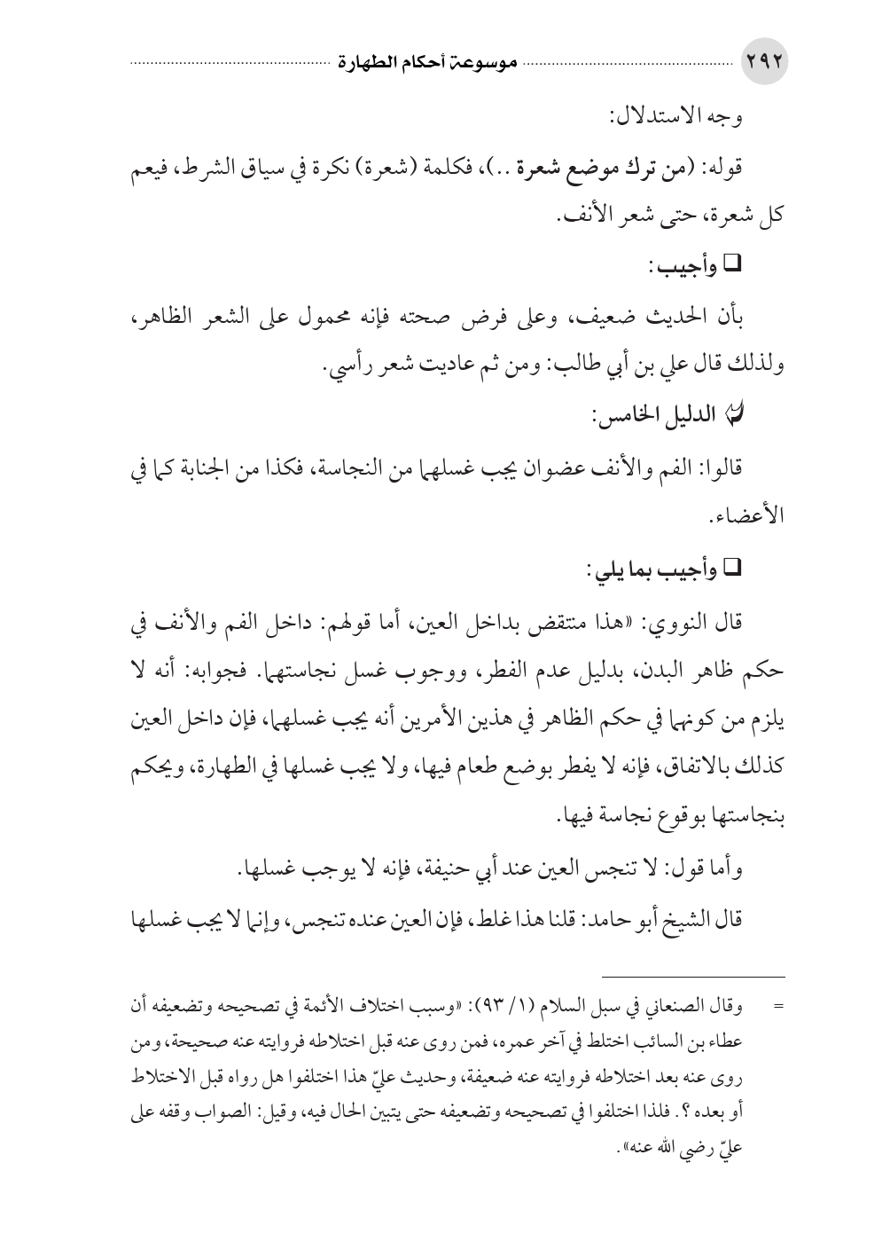 قال النووي: «هذا منتقض بداخل العين، أما قولهم: داخل الفم والأنف في حكم ظاهر البدن، بدليل عدم الفطر، ووجوب غسل نجاستهما. فجوابه: أنه لا يلزم من كونهما في حكم الظاهر في هذين الأمرين أنه يجب غسلهما، فإن داخل العين كذلك بالاتفاق، فإنه لا يفطر بوضع طعام فيها، ولا يجب غسلها في الطهارة، ويحكم بنجاستها بوقوع نجاسة فيها.