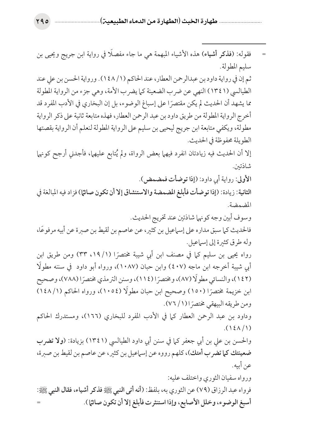 ثم إن في رواية داود بن عبدالرحمن العطار، عند الحاكم (١/ ١٤٨). ورواية الحسن بن علي عند الطيالسي (١٣٤١) النهي عن ضرب الضعينة كما يضرب الأمة، وهي جزء من الرواية المطولة مما يشهد أن الحديث لم يكن مقتصرًا على إسباغ الوضوء، بل إن البخاري في الأدب المفرد قد أخرج الرواية المطولة من طريق داود بن عبد الرحمن العطار، فهذه متابعة ثانية على ذكر الرواية مطولة، ويكفي متابعة ابن جريج ليحيى بن سليم على الرواية المطولة لنعلم أن الرواية بقصتها الطويلة محفوظة في الحديث.