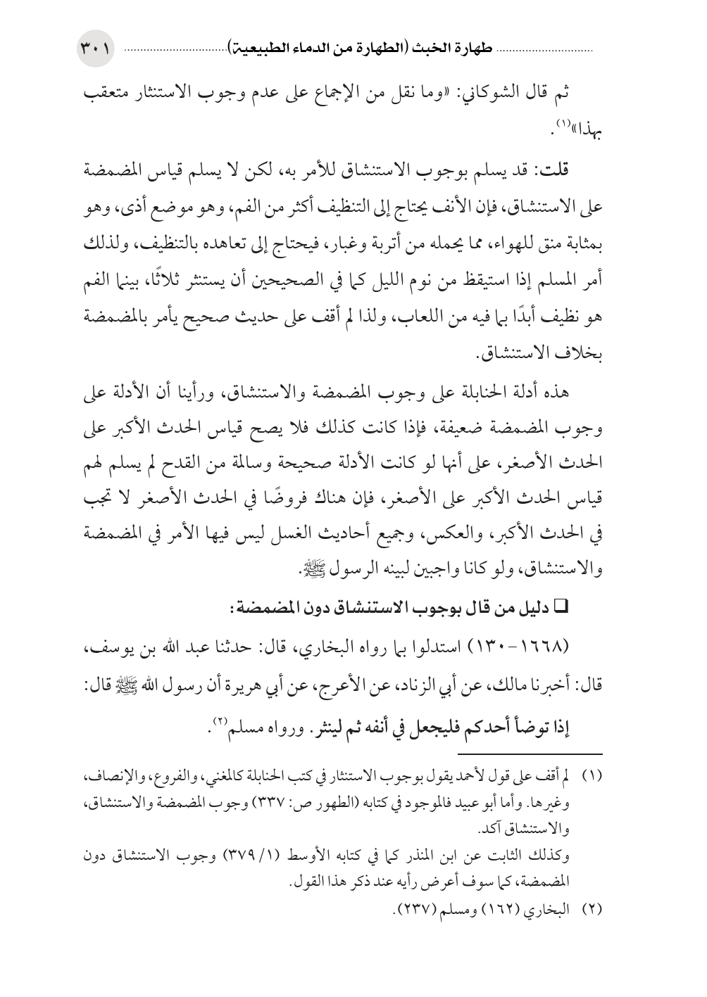 (¬١) لم أقف على قول لأحمد يقول بوجوب الاستنثار في كتب الحنابلة كالمغني، والفروع، والإنصاف، وغيرها. وأما أبو عبيد فالموجود في كتابه (الطهور ص: ٣٣٧) وجوب المضمضة والاستنشاق، والاستنشاق آكد.