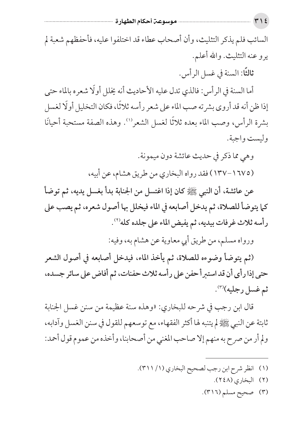 أما السنة في الرأس: فالذي تدل عليه الأحاديث أنه يخلل أولًا شعره بالماء حتى إذا ظن أنه قد أروى بشرته صب الماء على شعر رأسه ثلاثًا، فكان التخليل أولًا لغسل بشرة الرأس، وصب الماء بعده ثلاثًا لغسل الشعر (¬١). وهذه الصفة مستحبة أحيانًا وليست واجبة.