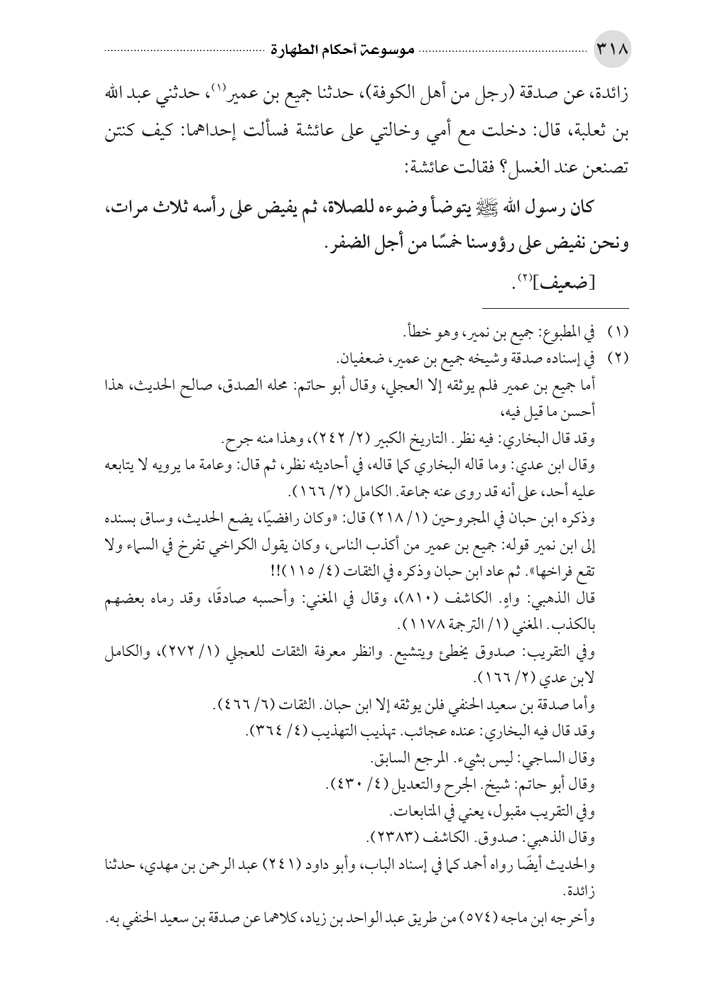 زائدة، عن صدقة (رجل من أهل الكوفة)، حدثنا جميع بن عمير (¬١)، حدثني عبد الله بن ثعلبة، قال: دخلت مع أمي وخالتي على عائشة فسألت إحداهما: كيف كنتن تصنعن عند الغسل؟ فقالت عائشة: