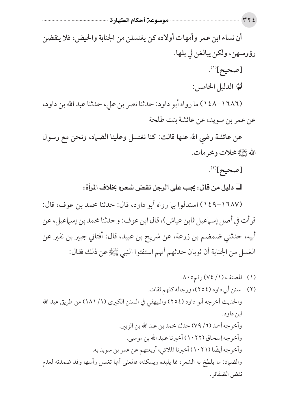 (١٦٨٧ - ١٤٩) استدلوا بما رواه أبو داود، قال: حدثنا محمد بن عوف، قال: قرأت في أصل إسماعيل (ابن عياش)، قال ابن عوف: وحدثنا محمد بن إسماعيل، عن أبيه، حدثني ضمضم بن زرعة، عن شريح بن عبيد، قال: أفتاني جبير بن نفير عن الغسل من الجنابة أن ثوبان حدثهم أنهم استفتوا النبي صلى الله عليه وسلم عن ذلك فقال: