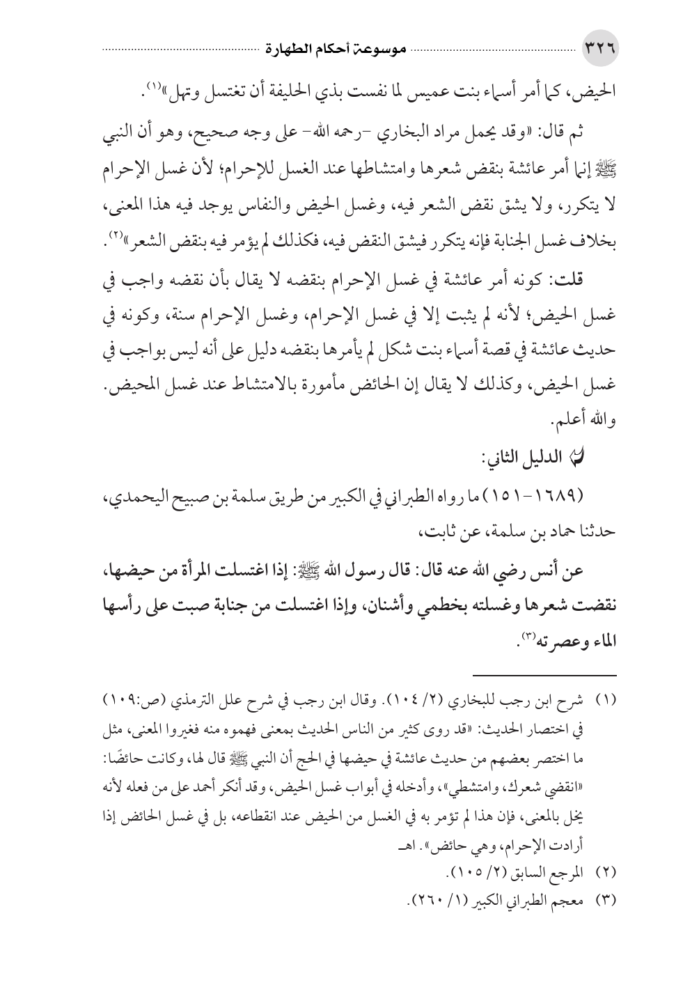 (¬١) شرح ابن رجب للبخاري (٢/ ١٠٤). وقال ابن رجب في شرح علل الترمذي (ص: ١٠٩) في اختصار الحديث: «قد روى كثير من الناس الحديث بمعنى فهموه منه فغيروا المعنى، مثل ما اختصر بعضهم من حديث عائشة في حيضها في الحج أن النبي صلى الله عليه وسلم قال لها، وكانت حائضًا: «انقضي شعرك، وامتشطي»، وأدخله في أبواب غسل الحيض، وقد أنكر أحمد على من فعله لأنه يخل بالمعنى، فإن هذا لم تؤمر به في الغسل من الحيض عند انقطاعه، بل في غسل الحائض إذا أرادت الإحرام، وهي حائض». اهـ