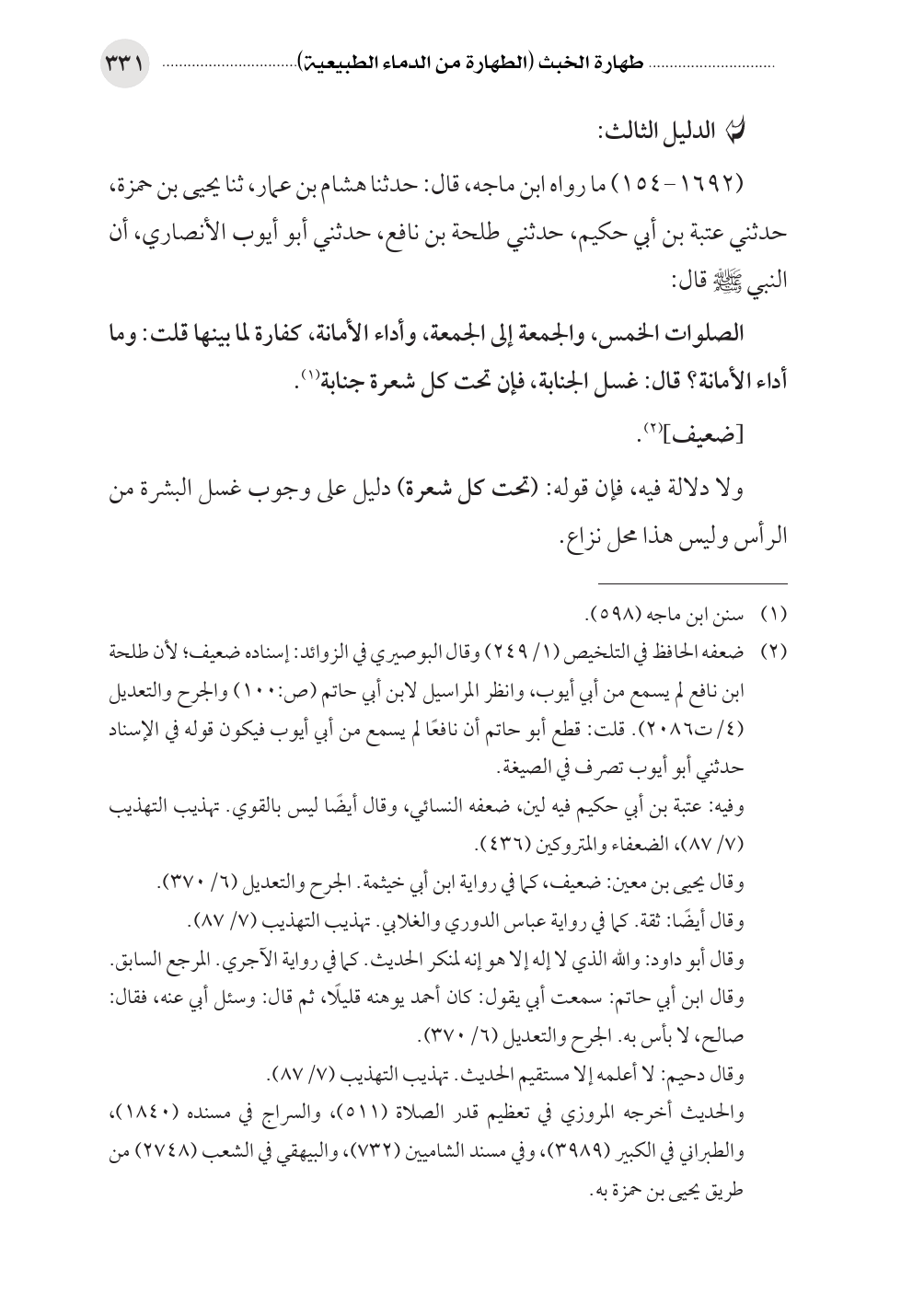 (١٦٩٢ - ١٥٤) ما رواه ابن ماجه، قال: حدثنا هشام بن عمار، ثنا يحيى بن حمزة، حدثني عتبة بن أبي حكيم، حدثني طلحة بن نافع، حدثني أبو أيوب الأنصاري، أن النبي صلى الله عليه وسلم قال: