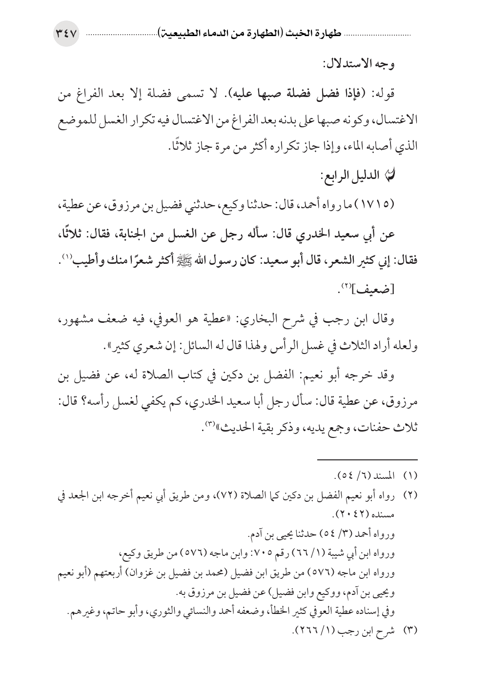 وقال ابن رجب في شرح البخاري: «عطية هو العوفي، فيه ضعف مشهور، ولعله أراد الثلاث في غسل الرأس ولهذا قال له السائل: إن شعري كثير».