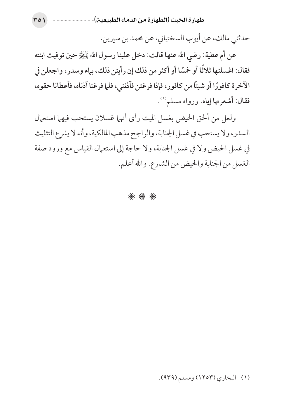 حدثني مالك، عن أيوب السختياني، عن محمد بن سيرين، عن أم عطية: رضي الله عنها قالت: دخل علينا رسول الله صلى الله عليه وسلم حين توفيت ابنته فقال: اغسلنها ثلاثًا أو خمسًا أو أكثر من ذلك إن رأيتن ذلك، بماء وسدر، واجعلن في الآخرة كافورًا أو شيئًا من كافور، فإذا فرغتن فآذنني، فلما فرغنا آذناه، فأعطانا حقوه، فقال: أشعرنها إياه. ورواه مسلم (¬١).