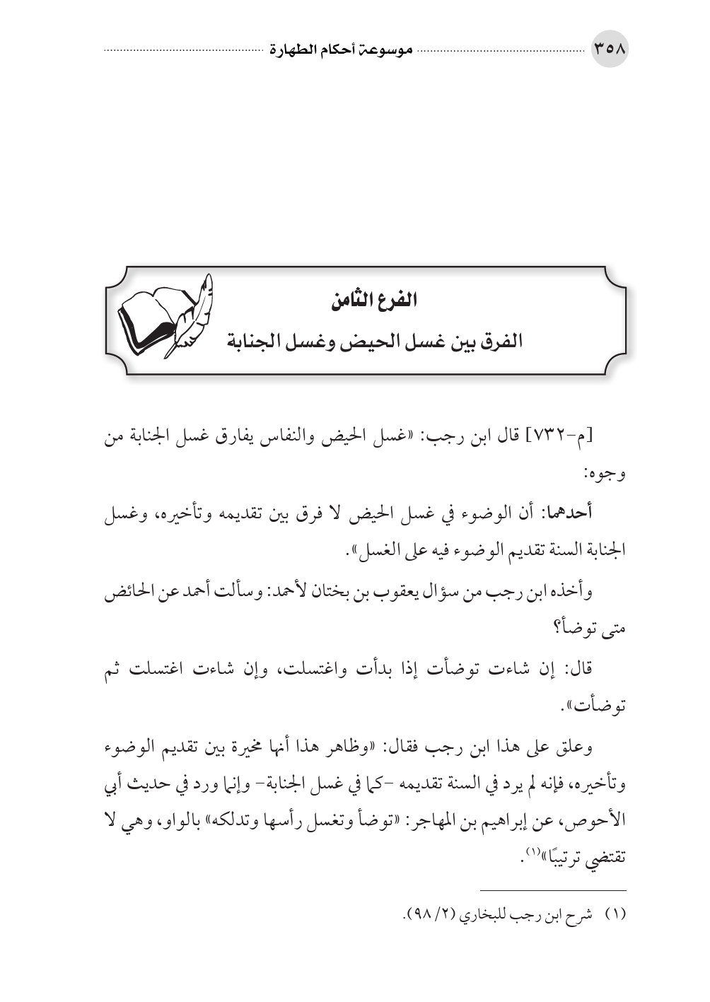 [م-٧٣٢] قال ابن رجب: «غسل الحيض والنفاس يفارق غسل الجنابة من وجوه: