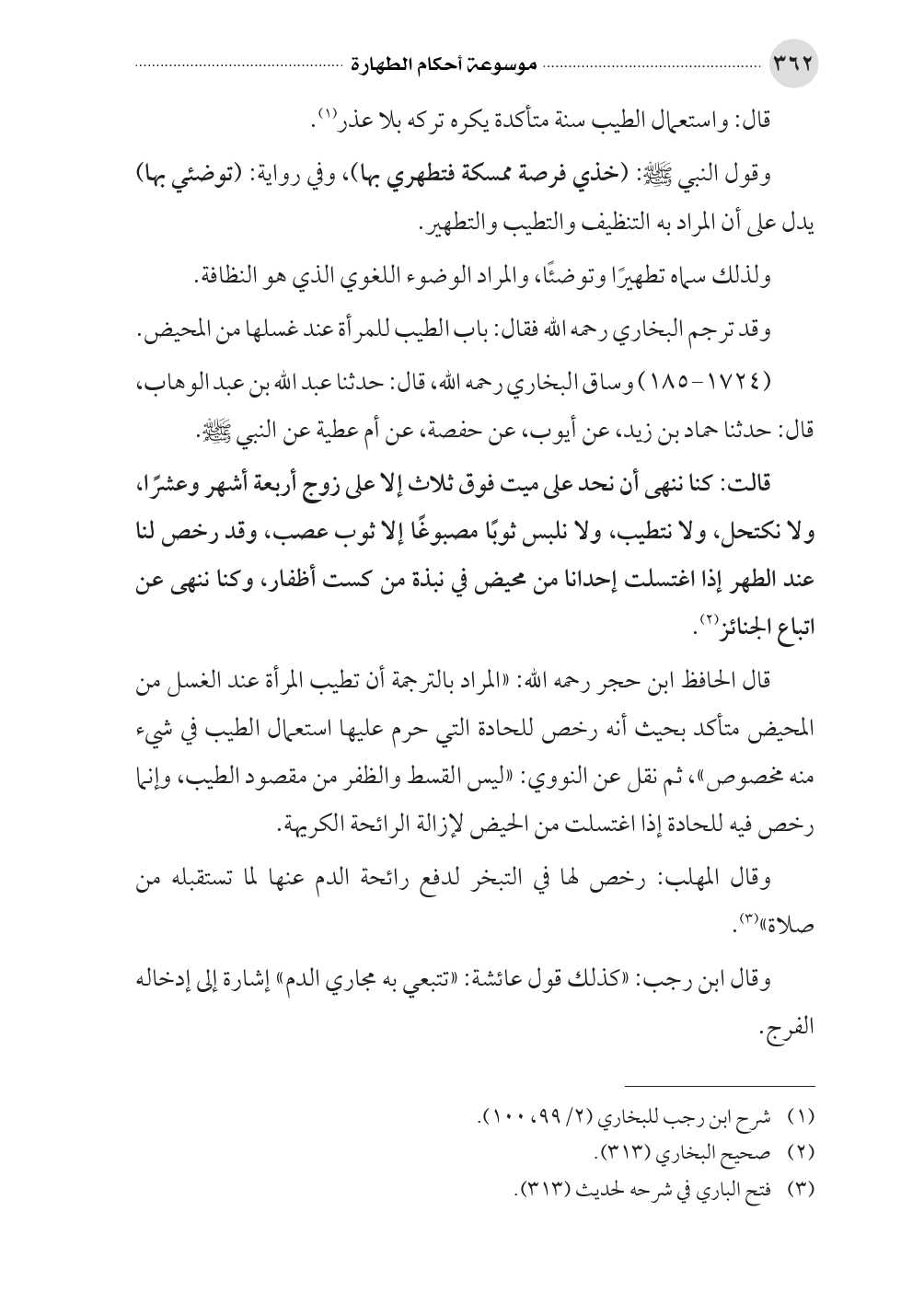 وقال المهلب: رخص لها في التبخر لدفع رائحة الدم عنها لما تستقبله من صلاة» (¬٣).