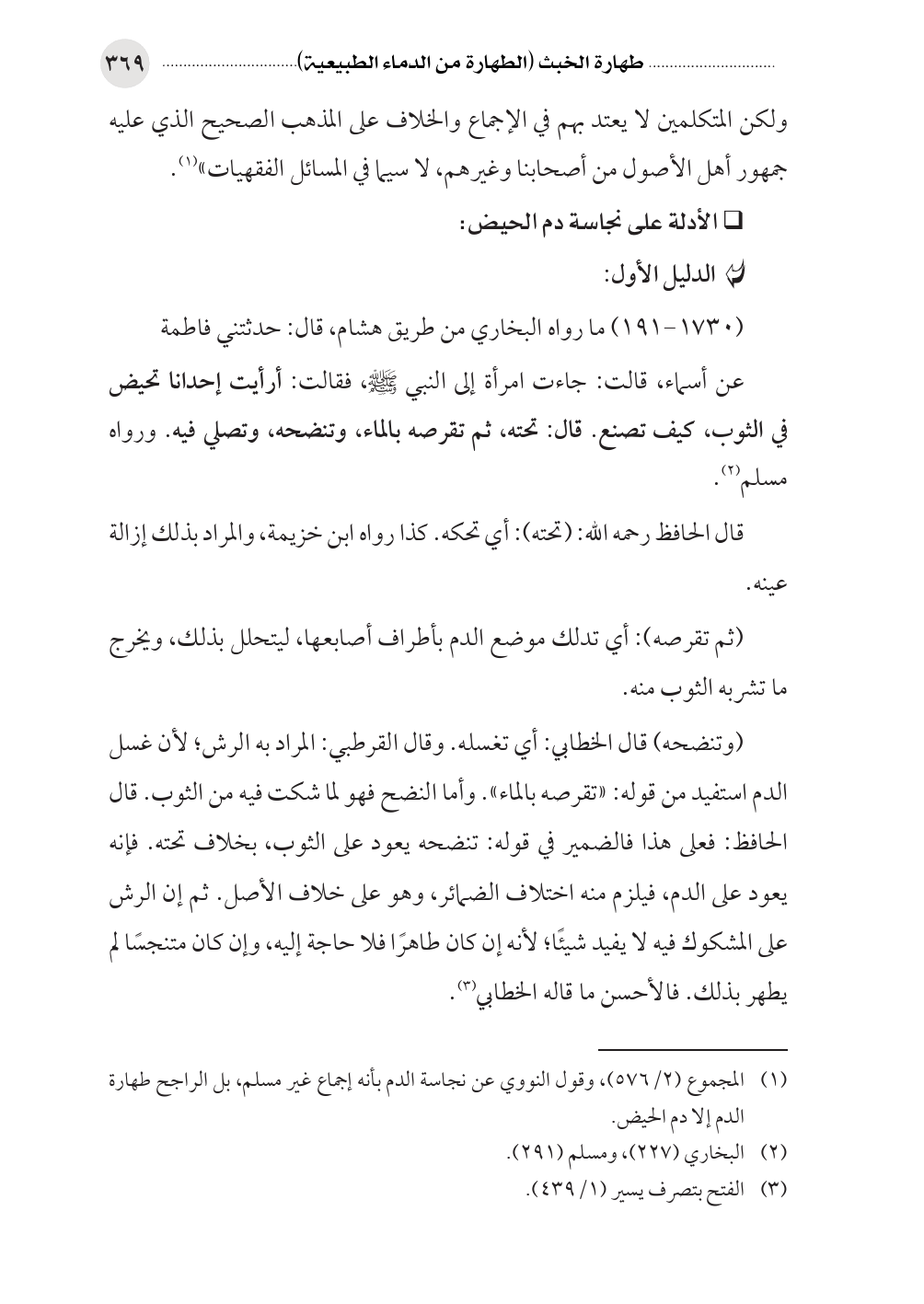 (¬١) المجموع (٢/ ٥٧٦)، وقول النووي عن نجاسة الدم بأنه إجماع غير مسلم، بل الراجح طهارة الدم إلا دم الحيض.