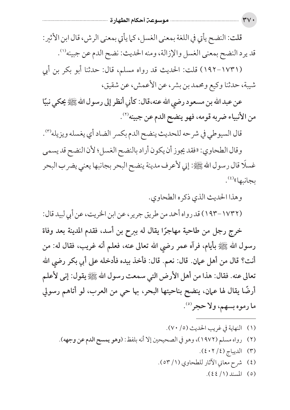 قال السيوطي في شرحه للحديث ينضح الدم بكسر الضاد أي يغسله ويزيله (¬٣).