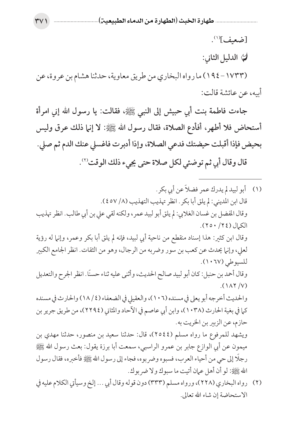 (¬٢) رواه البخاري (٢٢٨)، ورواه مسلم (٣٣٣) دون قوله وقال أبي ... إلخ وسيأتي الكلام عليه في الاستحاضة إن شاء الله تعالى.