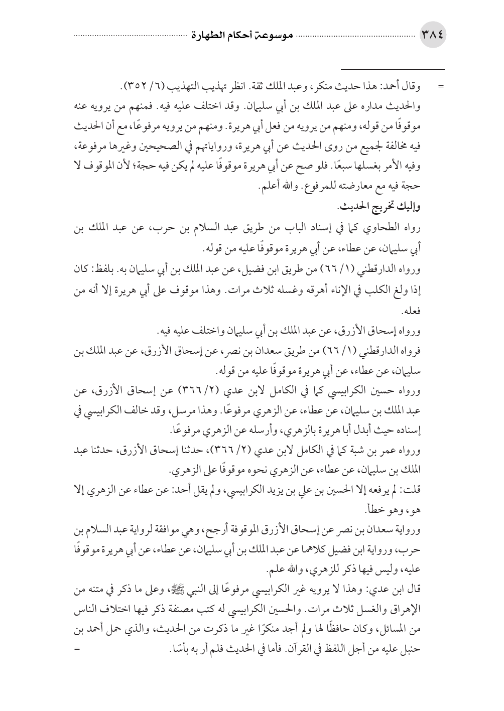 والحديث مداره على عبد الملك بن أبي سليمان. وقد اختلف عليه فيه. فمنهم من يرويه عنه موقوفًا من قوله، ومنهم من يرويه من فعل أبي هريرة. ومنهم من يرويه مرفوعًا، مع أن الحديث فيه مخالفة لجميع من روى الحديث عن أبي هريرة، ورواياتهم في الصحيحين وغيرها مرفوعة، وفيه الأمر بغسلها سبعًا. فلو صح عن أبي هريرة موقوفًا عليه لم يكن فيه حجة؛ لأن الموقوف لا حجة فيه مع معارضته للمرفوع. والله أعلم.