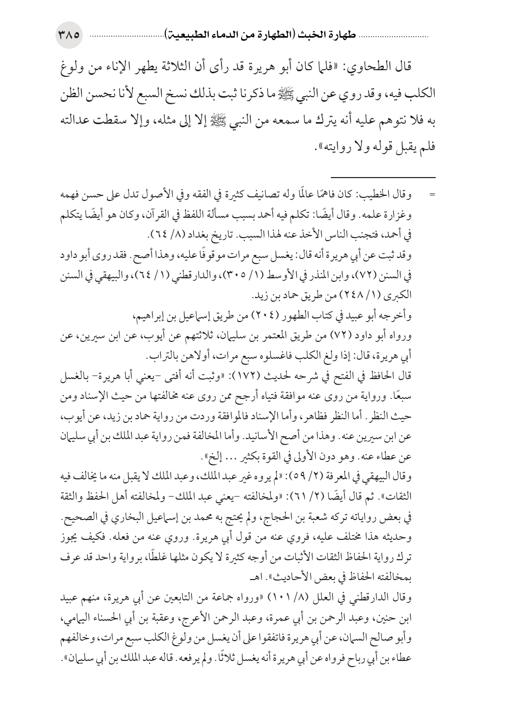قال الحافظ في الفتح في شرحه لحديث (١٧٢): «وثبت أنه أفتى -يعني أبا هريرة- بالغسل سبعًا. ورواية من روى عنه موافقة فتياه أرجح ممن روى عنه مخالفتها من حيث الإسناد ومن حيث النظر. أما النظر فظاهر، وأما الإسناد فالموافقة وردت من رواية حماد بن زيد، عن أيوب، عن ابن سيرين عنه. وهذا من أصح الأسانيد. وأما المخالفة فمن رواية عبد الملك بن أبي سليمان عن عطاء عنه. وهو دون الأولى في القوة بكثير ... إلخ».