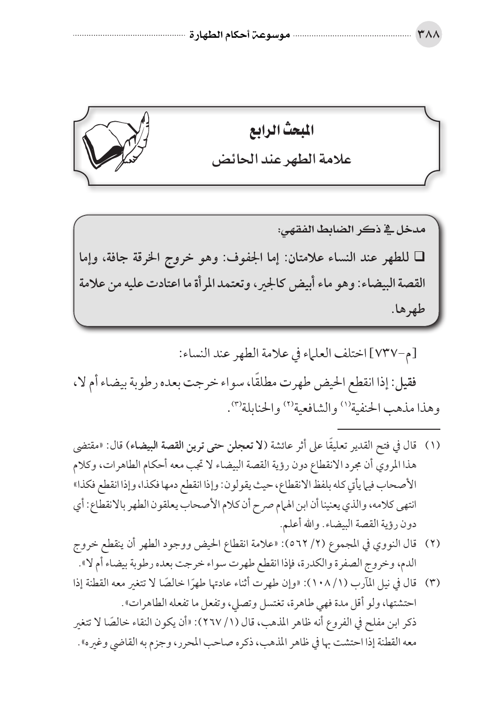 (¬١) قال في فتح القدير تعليقًا على أثر عائشة (لا تعجلن حتى ترين القصة البيضاء) قال: «مقتضى هذا المروي أن مجرد الانقطاع دون رؤية القصة البيضاء لا تجب معه أحكام الطاهرات، وكلام الأصحاب فيما يأتي كله بلفظ الانقطاع، حيث يقولون: وإذا انقطع دمها فكذا، وإذا انقطع فكذا» انتهى كلامه، والذي يعنينا أن ابن الهمام صرح أن كلام الأصحاب يعلقون الطهر بالانقطاع: أي دون رؤية القصة البيضاء. والله أعلم.