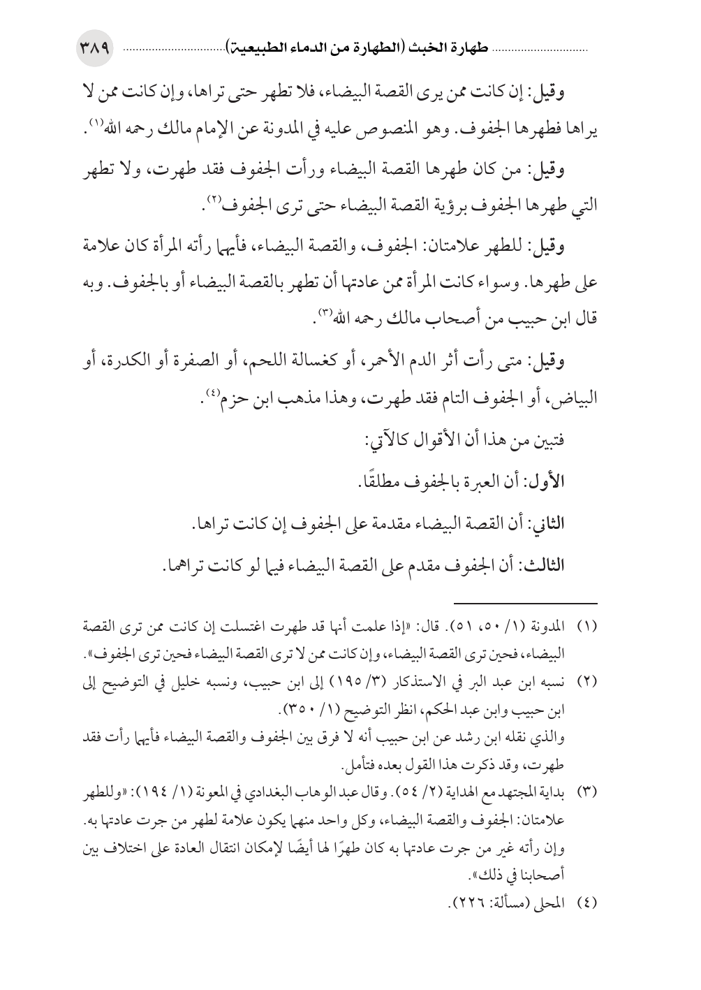 (¬٣) بداية المجتهد مع الهداية (٢/ ٥٤). وقال عبد الوهاب البغدادي في المعونة (١/ ١٩٤): «وللطهر علامتان: الجفوف والقصة البيضاء، وكل واحد منهما يكون علامة لطهر من جرت عادتها به. وإن رأته غير من جرت عادتها به كان طهرًا لها أيضًا لإمكان انتقال العادة على اختلاف بين أصحابنا في ذلك».