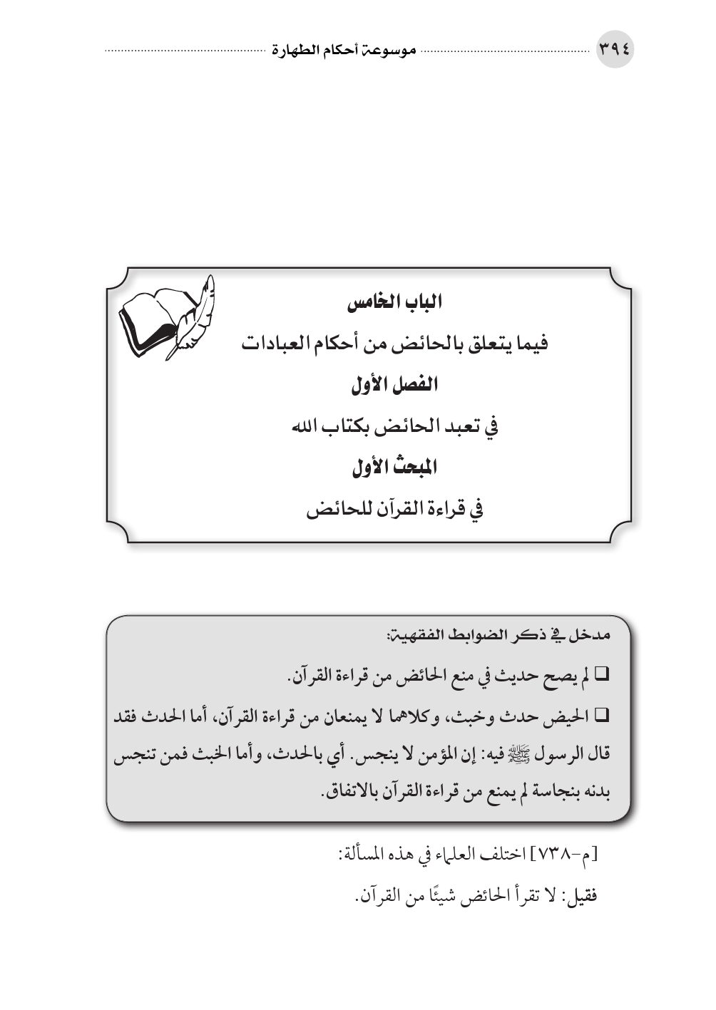 • الحيض حدث وخبث، وكلاهما لا يمنعان من قراءة القرآن، أما الحدث فقد قال الرسول صلى الله عليه وسلم فيه: إن المؤمن لا ينجس. أي بالحدث، وأما الخبث فمن تنجس بدنه بنجاسة لم يمنع من قراءة القرآن بالاتفاق.