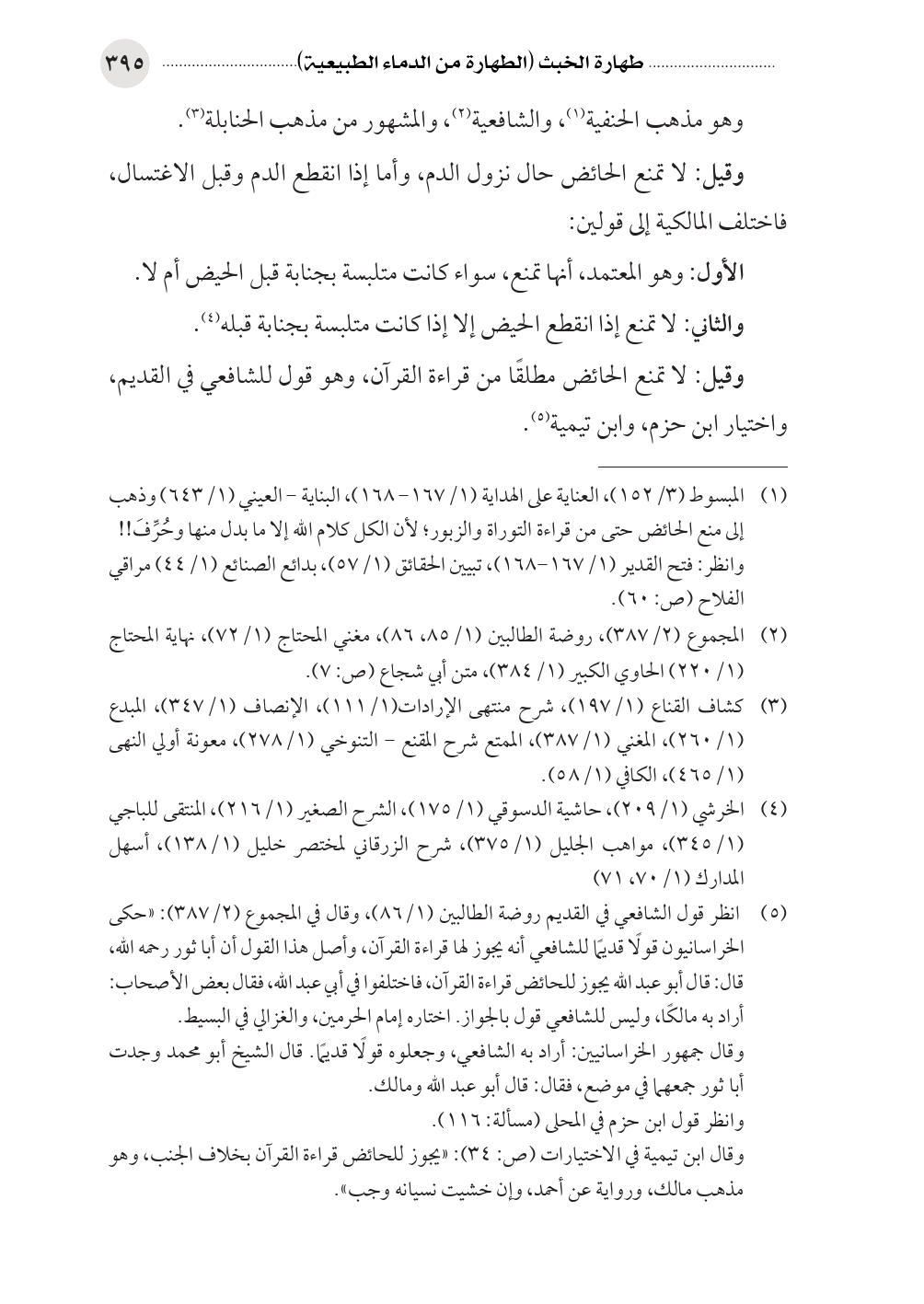 (¬٥) انظر قول الشافعي في القديم روضة الطالبين (١/ ٨٦)، وقال في المجموع (٢/ ٣٨٧): «حكى الخراسانيون قولًا قديمًا للشافعي أنه يجوز لها قراءة القرآن، وأصل هذا القول أن أبا ثور رحمه الله، قال: قال أبو عبد الله يجوز للحائض قراءة القرآن، فاختلفوا في أبي عبد الله، فقال بعض الأصحاب: أراد به مالكًا، وليس للشافعي قول بالجواز. اختاره إمام الحرمين، والغزالي في البسيط.