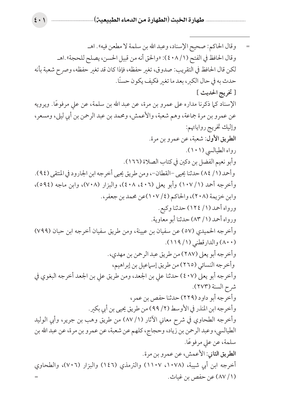 وأخرجه الطحاوي في شرح معاني الآثار (١/ ٨٧) من طريق وهب بن جرير، وأبي الوليد الطيالسي، وعبد الرحمن بن زياد، وحجاج، كلهم عن شعبة، عن عمرو بن مرة، عن عبد الله بن سلمة، عن علي مرفوعًا.