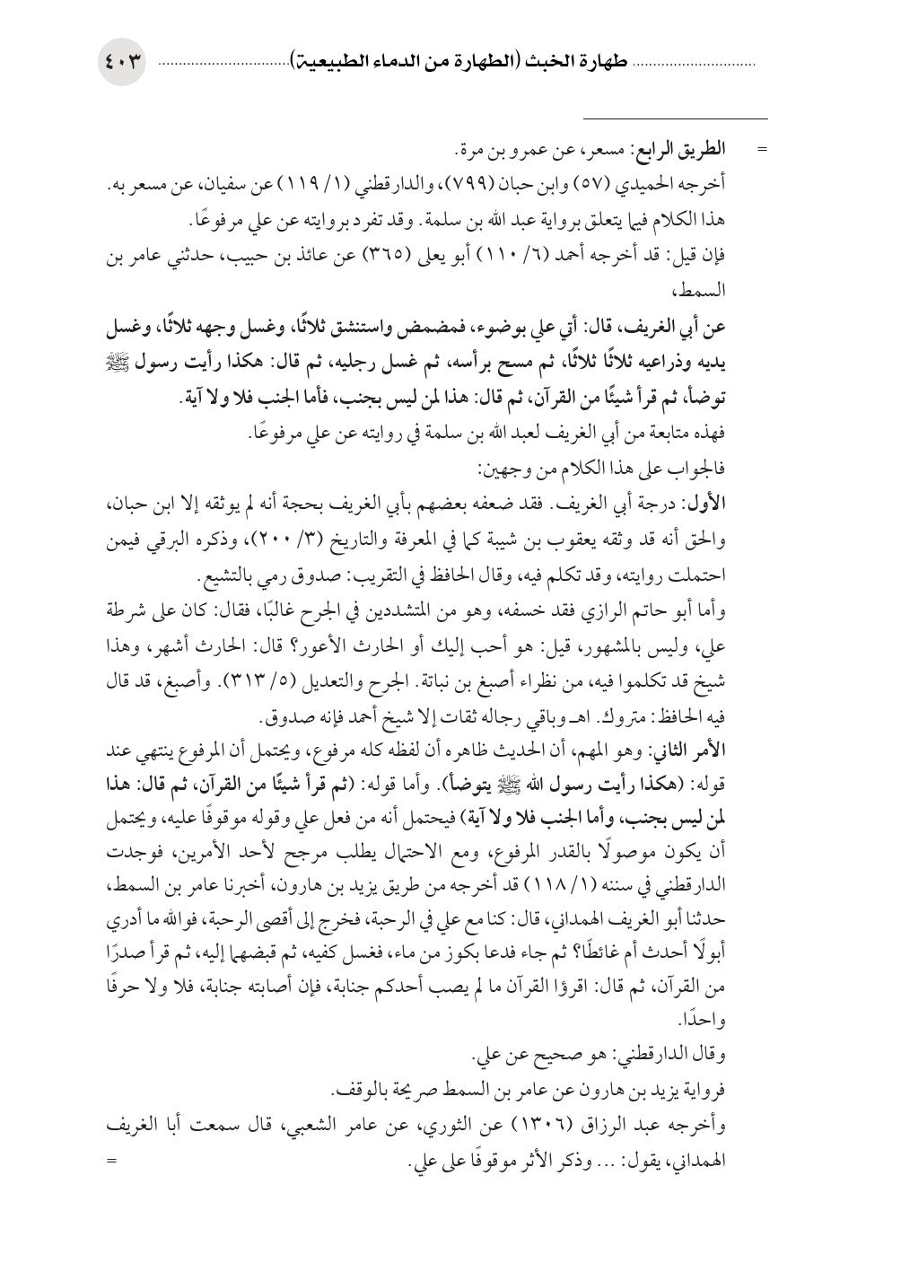 الأمر الثاني: وهو المهم، أن الحديث ظاهره أن لفظه كله مرفوع، ويحتمل أن المرفوع ينتهي عند قوله: (هكذا رأيت رسول الله صلى الله عليه وسلم يتوضأ). وأما قوله: (ثم قرأ شيئًا من القرآن، ثم قال: هذا لمن ليس بجنب، وأما الجنب فلا ولا آية) فيحتمل أنه من فعل علي وقوله موقوفًا عليه، ويحتمل أن يكون موصولًا بالقدر المرفوع، ومع الاحتمال يطلب مرجح لأحد الأمرين، فوجدت الدارقطني في سننه (١/ ١١٨) قد أخرجه من طريق يزيد بن هارون، أخبرنا عامر بن السمط، حدثنا أبو الغريف الهمداني، قال: كنا مع علي في الرحبة، فخرج إلى أقصى الرحبة، فوالله ما أدري أبولًا أحدث أم غائطًا؟ ثم جاء فدعا بكوز من ماء، فغسل كفيه، ثم قبضهما إليه، ثم قرأ صدرًا من القرآن، ثم قال: اقرؤا القرآن ما لم يصب أحدكم جنابة، فإن أصابته جنابة، فلا ولا حرفًا واحدًا.