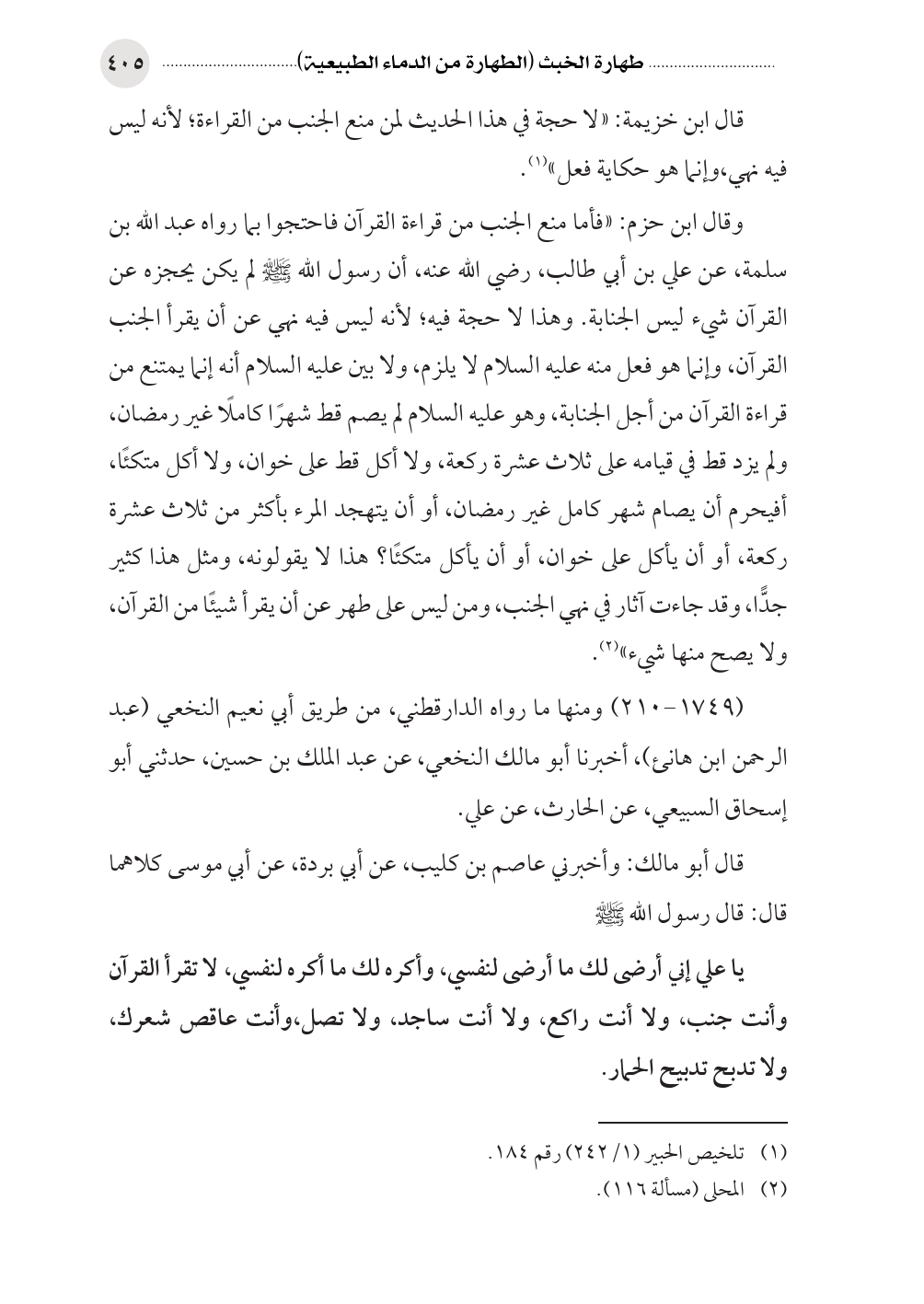وقال ابن حزم: «فأما منع الجنب من قراءة القرآن فاحتجوا بما رواه عبد الله بن سلمة، عن علي بن أبي طالب، رضي الله عنه، أن رسول الله صلى الله عليه وسلم لم يكن يحجزه عن القرآن شيء ليس الجنابة. وهذا لا حجة فيه؛ لأنه ليس فيه نهي عن أن يقرأ الجنب القرآن، وإنما هو فعل منه عليه السلام لا يلزم، ولا بين عليه السلام أنه إنما يمتنع من قراءة القرآن من أجل الجنابة، وهو عليه السلام لم يصم قط شهرًا كاملًا غير رمضان، ولم يزد قط في قيامه على ثلاث عشرة ركعة، ولا أكل قط على خوان، ولا أكل متكئًا، أفيحرم أن يصام شهر كامل غير رمضان، أو أن يتهجد المرء بأكثر من ثلاث عشرة ركعة، أو أن يأكل على خوان، أو أن يأكل متكئًا؟ هذا لا يقولونه، ومثل هذا كثير جدًّا، وقد جاءت آثار في نهي الجنب، ومن ليس على طهر عن أن يقرأ شيئًا من القرآن، ولا يصح منها شيء» (¬٢).