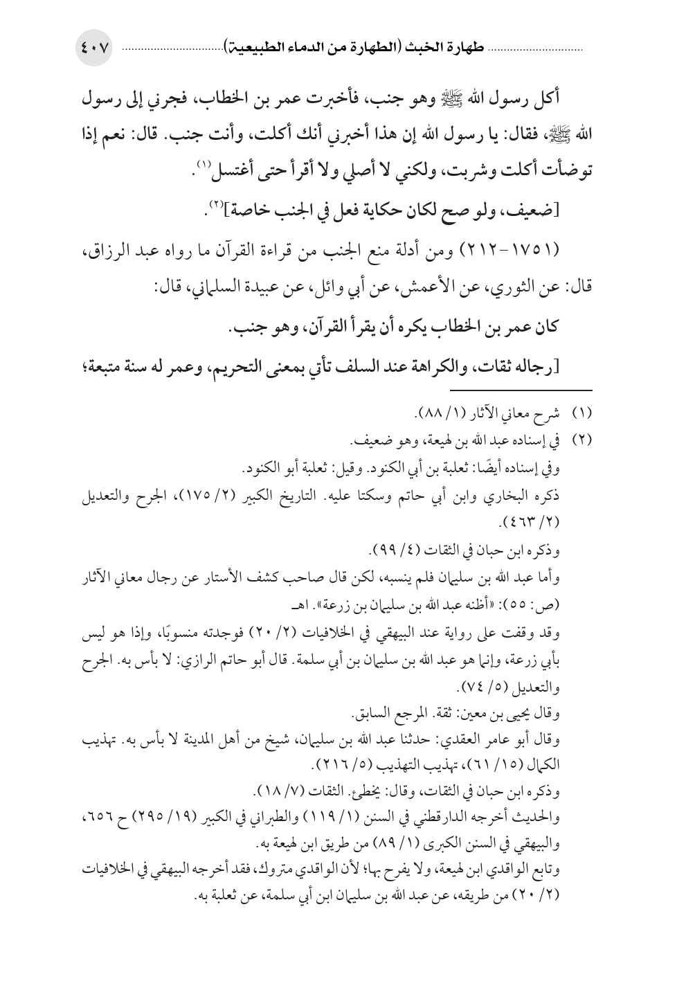 (١٧٥١ - ٢١٢) ومن أدلة منع الجنب من قراءة القرآن ما رواه عبد الرزاق، قال: عن الثوري، عن الأعمش، عن أبي وائل، عن عبيدة السلماني، قال: