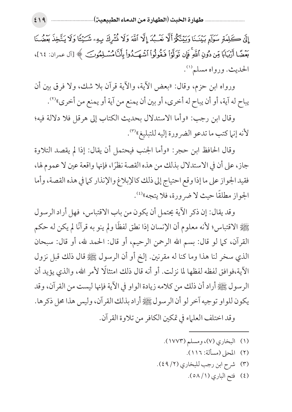 وقال الحافظ ابن حجر: «وأما الجنب فيحتمل أن يقال: إذا لم يقصد التلاوة جاز، على أن في الاستدلال بذلك من هذه القصة نظرًا، فإنها واقعة عين لا عموم لها، فقيد الجواز على ما إذا وقع احتياج إلى ذلك كالإبلاغ والإنذار كما في هذه القصة، وأما الجواز مطلقًا حيث لا ضرورة، فلا يتجه» (¬٤).