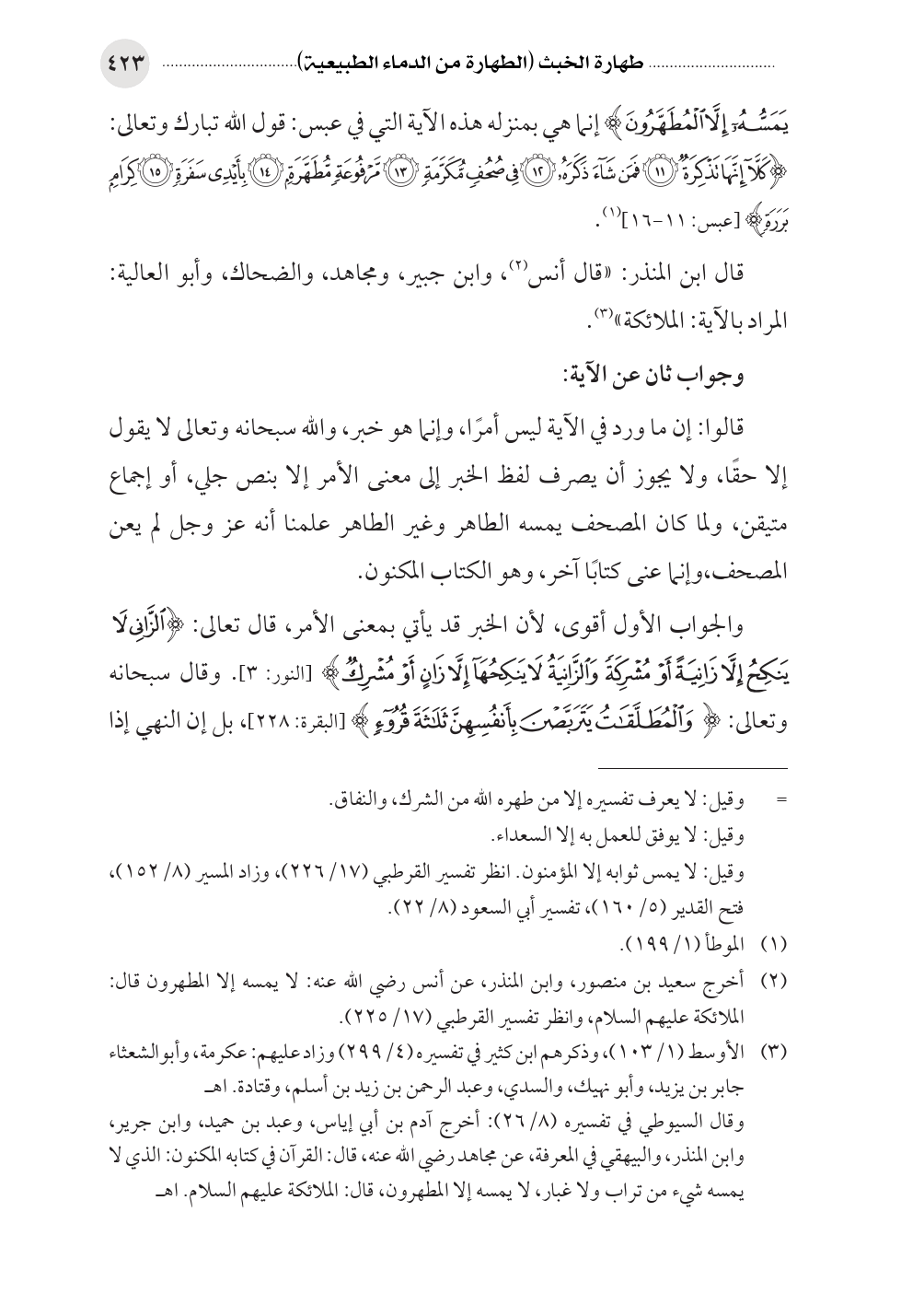 يَمَسُّهُ إِلَّا الْمُطَهَّرُونَ) إنما هي بمنزله هذه الآية التي في عبس: قول الله تبارك وتعالى: (كَلَاّ إِنَّهَا تَذْكِرَةٌ (١١) فَمَن شَاءَ ذَكَرَهُ (١٢) فِي صُحُفٍ مُّكَرَّمَةٍ (١٣) مَّرْفُوعَةٍ مُّطَهَّرَةٍ (١٤) بِأَيْدِي سَفَرَةٍ (١٥) كِرَامٍ بَرَرَةٍ) [عبس: ١١ - ١٦] (¬١).