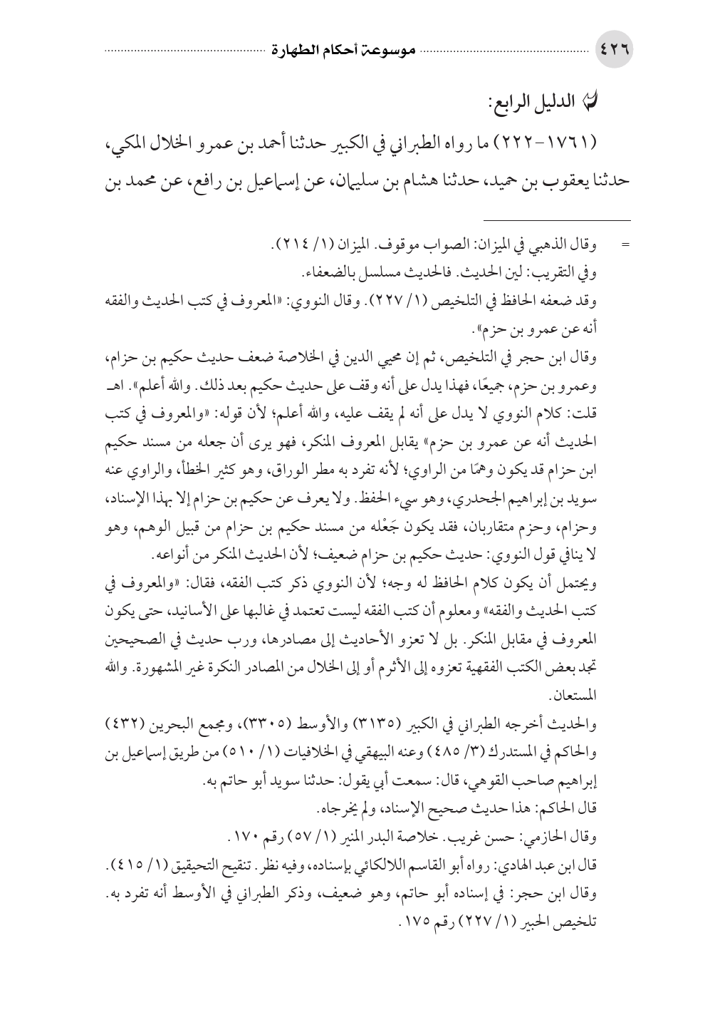 (١٧٦١ - ٢٢٢) ما رواه الطبراني في الكبير حدثنا أحمد بن عمرو الخلال المكي، حدثنا يعقوب بن حميد، حدثنا هشام بن سليمان، عن إسماعيل بن رافع، عن محمد بن