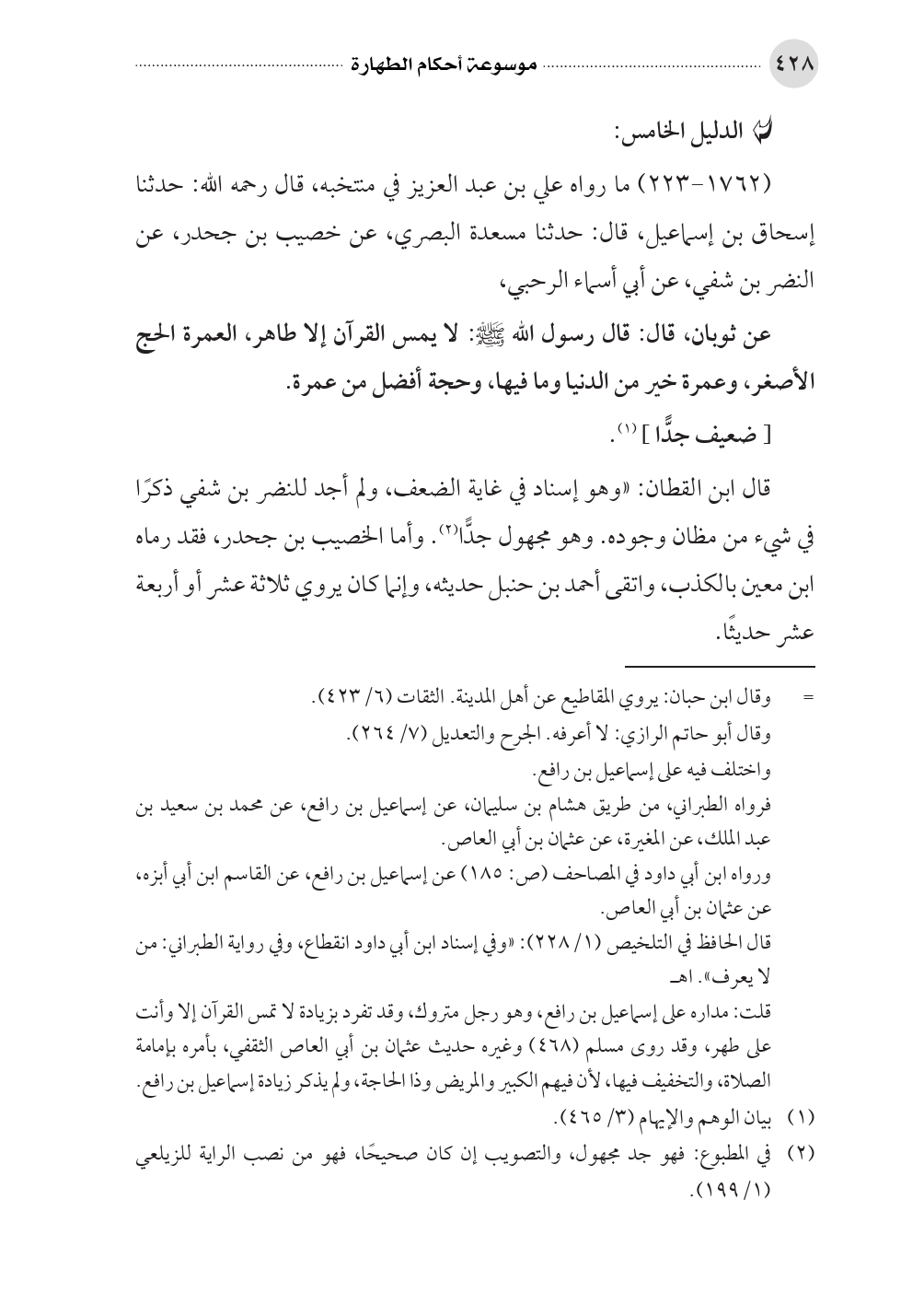 قال ابن القطان: «وهو إسناد في غاية الضعف، ولم أجد للنضر بن شفي ذكرًا في شيء من مظان وجوده. وهو مجهول جدًّا (¬٢). وأما الخصيب بن جحدر، فقد رماه ابن معين بالكذب، واتقى أحمد بن حنبل حديثه، وإنما كان يروي ثلاثة عشر أو أربعة عشر حديثًا.