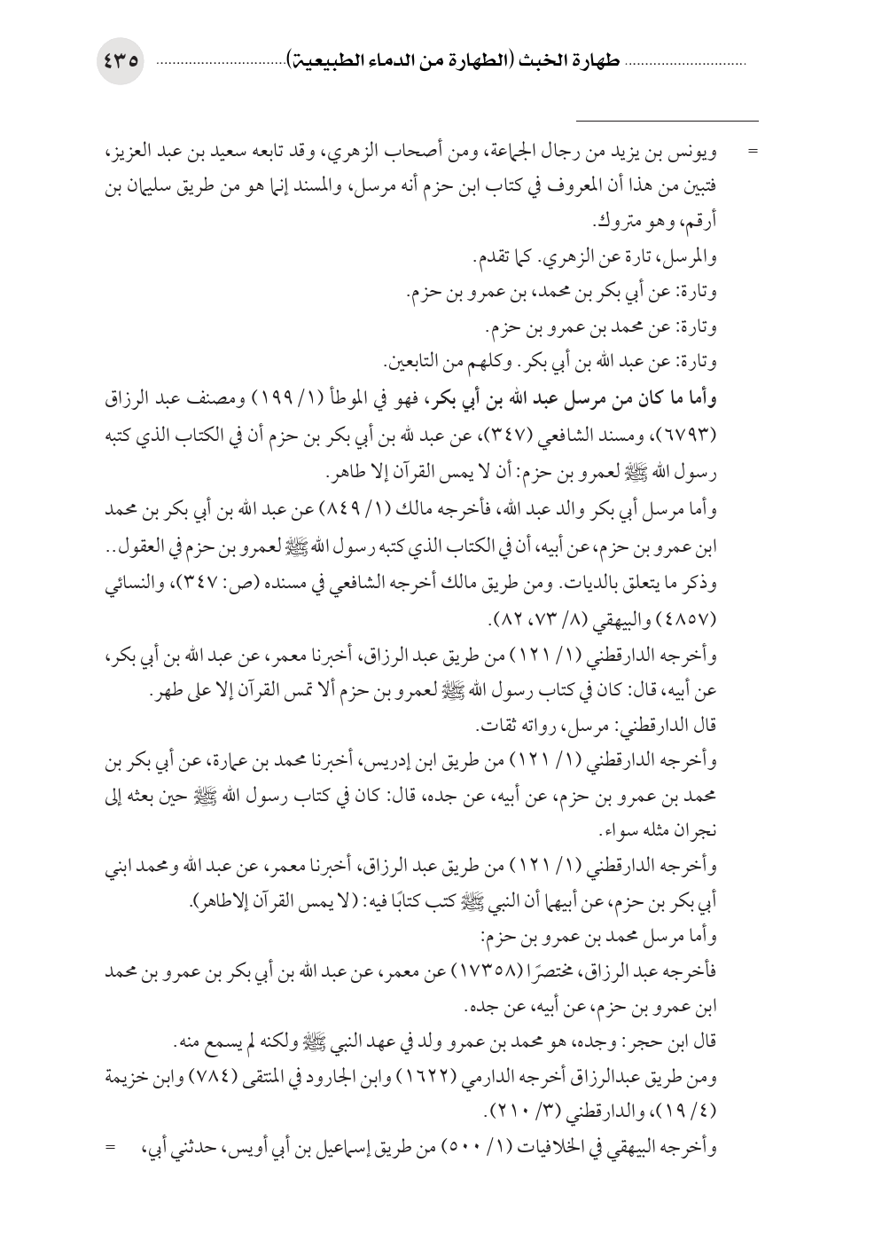 وأما ما كان من مرسل عبد الله بن أبي بكر، فهو في الموطأ (١/ ١٩٩) ومصنف عبد الرزاق (٦٧٩٣)، ومسند الشافعي (٣٤٧)، عن عبد لله بن أبي بكر بن حزم أن في الكتاب الذي كتبه رسول الله صلى الله عليه وسلم لعمرو بن حزم: أن لا يمس القرآن إلا طاهر.