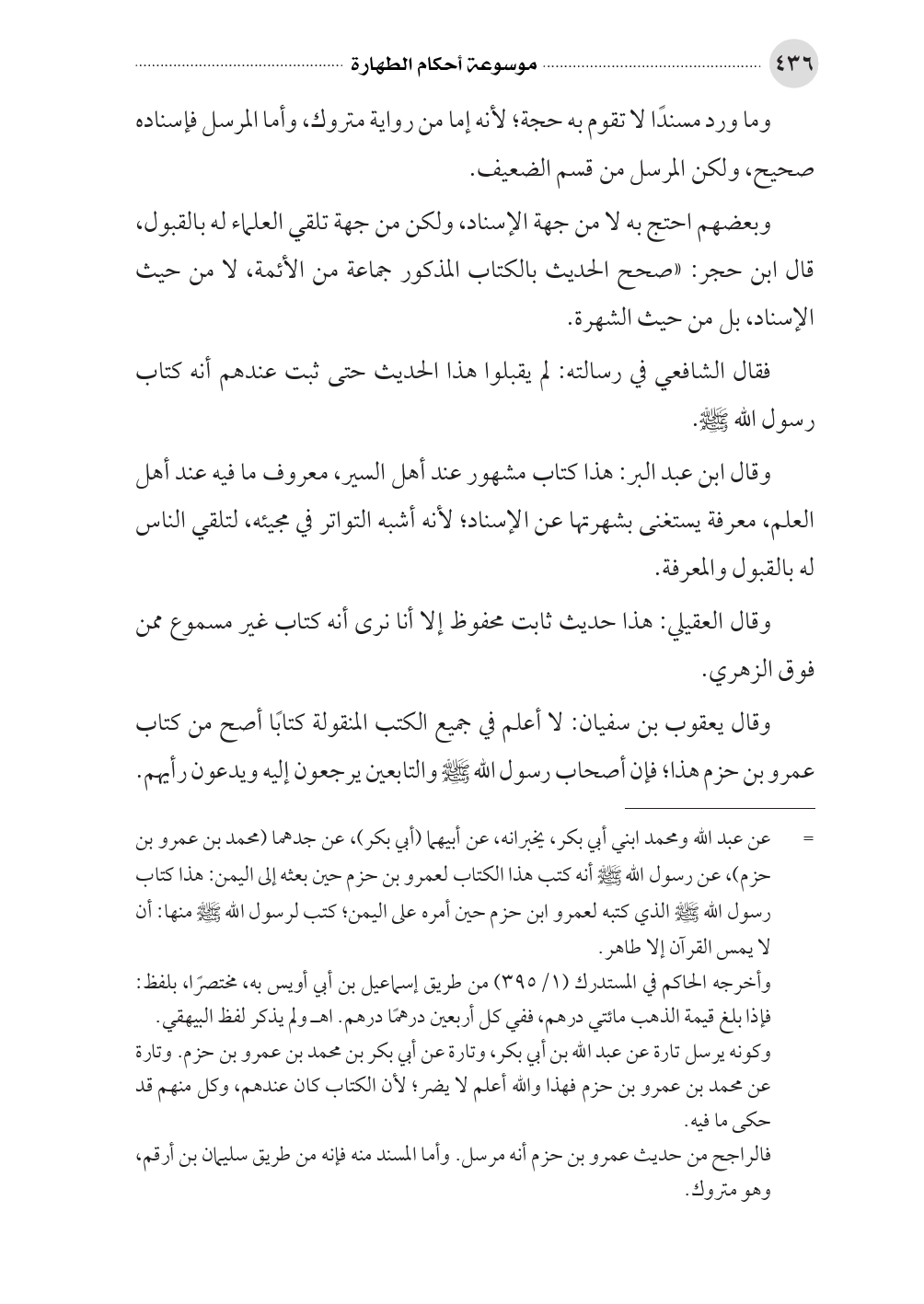 وقال يعقوب بن سفيان: لا أعلم في جميع الكتب المنقولة كتابًا أصح من كتاب عمرو بن حزم هذا؛ فإن أصحاب رسول الله صلى الله عليه وسلم والتابعين يرجعون إليه ويدعون رأيهم.
