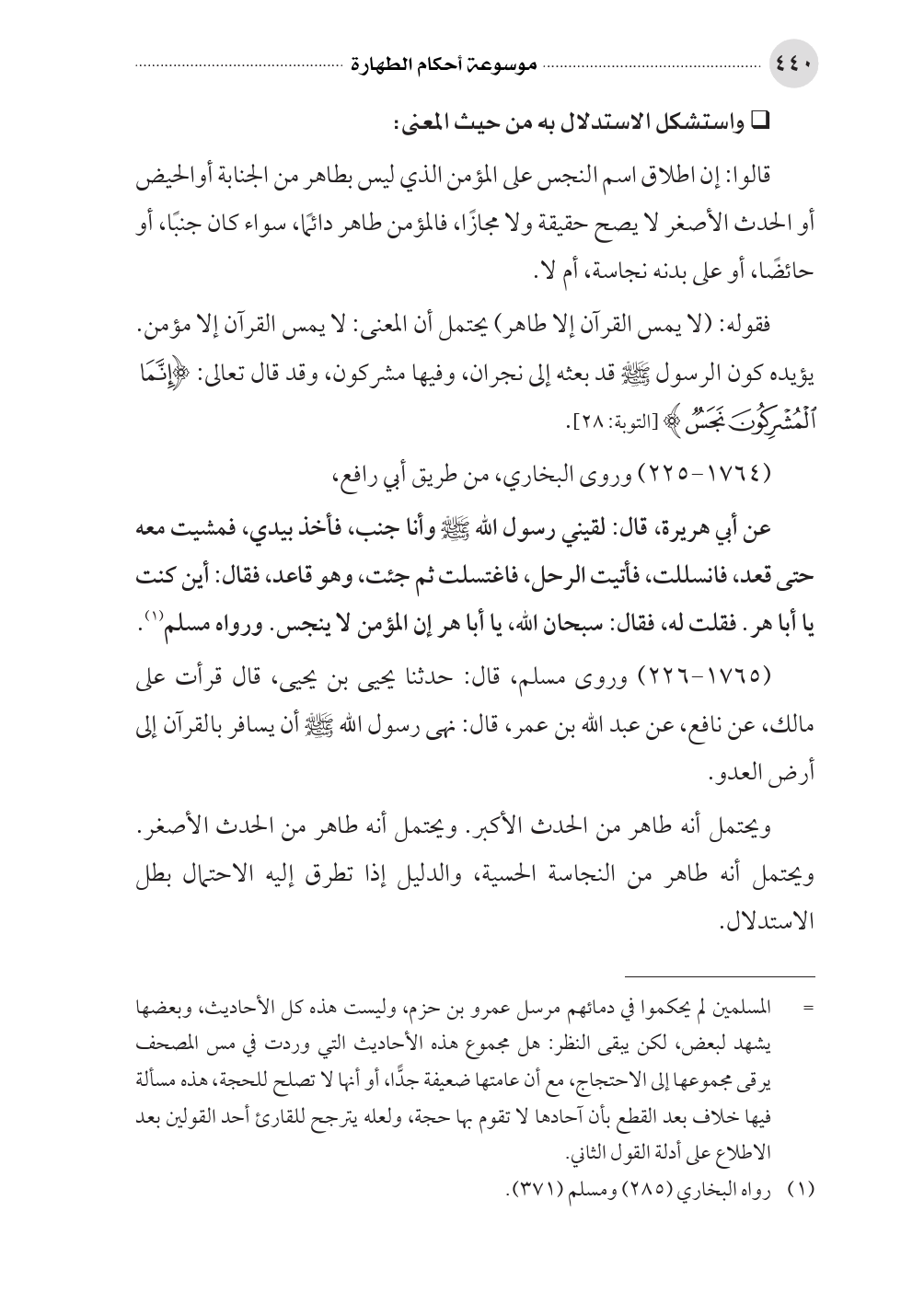 = المسلمين لم يحكموا في دمائهم مرسل عمرو بن حزم، وليست هذه كل الأحاديث، وبعضها يشهد لبعض، لكن يبقى النظر: هل مجموع هذه الأحاديث التي وردت في مس المصحف يرقى مجموعها إلى الاحتجاج، مع أن عامتها ضعيفة جدًّا، أو أنها لا تصلح للحجة، هذه مسألة فيها خلاف بعد القطع بأن آحادها لا تقوم بها حجة، ولعله يترجح للقارئ أحد القولين بعد الاطلاع على أدلة القول الثاني.