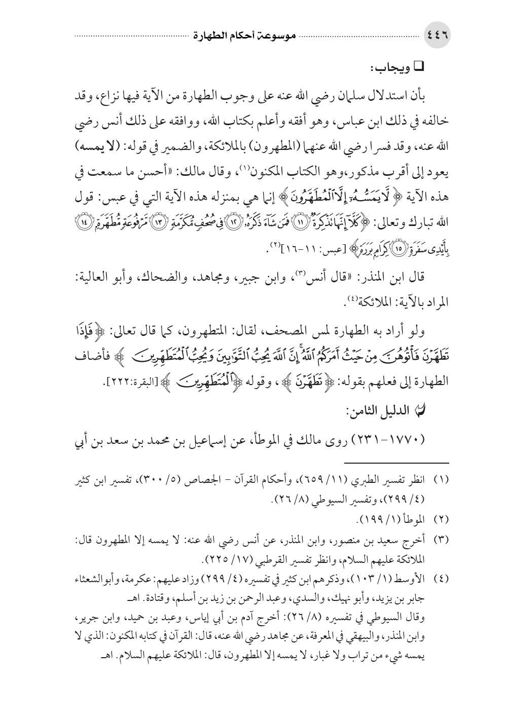 بأن استدلال سلمان رضي الله عنه على وجوب الطهارة من الآية فيها نزاع، وقد خالفه في ذلك ابن عباس، وهو أفقه وأعلم بكتاب الله، ووافقه على ذلك أنس رضي الله عنه، وقد فسرا رضي الله عنهما (المطهرون) بالملائكة، والضمير في قوله: (لا يمسه) يعود إلى أقرب مذكور، وهو الكتاب المكنون (¬١)، وقال مالك: «أحسن ما سمعت في هذه الآية (لَاّ يَمَسُّهُ إِلَاّ الْمُطَهَّرُونَ) إنما هي بمنزله هذه الآية التي في عبس: قول الله تبارك وتعالى: (كَلَاّ إِنَّهَا تَذْكِرَةٌ (١١) فَمَن شَاءَ ذَكَرَهُ (١٢) فِي صُحُفٍ مُّكَرَّمَةٍ (١٣) مَّرْفُوعَةٍ مُّطَهَّرَةٍ (١٤) بِأَيْدِي سَفَرَةٍ (١٥) كِرَامٍ بَرَرَةٍ) [عبس: ١١ - ١٦] (¬٢).
