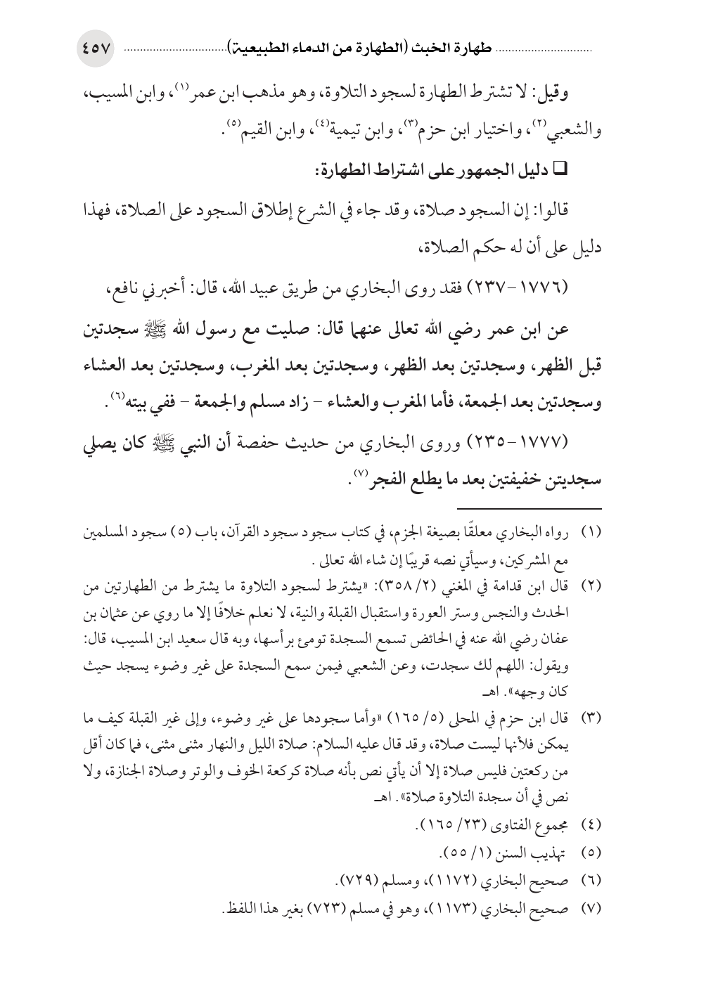 (¬٣) قال ابن حزم في المحلى (٥/ ١٦٥) «وأما سجودها على غير وضوء، وإلى غير القبلة كيف ما يمكن فلأنها ليست صلاة، وقد قال عليه السلام: صلاة الليل والنهار مثنى مثنى، فما كان أقل من ركعتين فليس صلاة إلا أن يأتي نص بأنه صلاة كركعة الخوف والوتر وصلاة الجنازة، ولا نص في أن سجدة التلاوة صلاة». اهـ