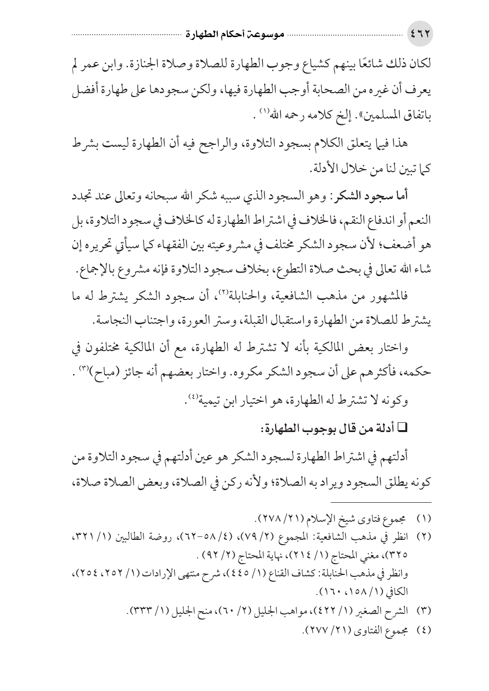 لكان ذلك شائعًا بينهم كشياع وجوب الطهارة للصلاة وصلاة الجنازة. وابن عمر لم يعرف أن غيره من الصحابة أوجب الطهارة فيها، ولكن سجودها على طهارة أفضل باتفاق المسلمين». إلخ كلامه رحمه الله (¬١).