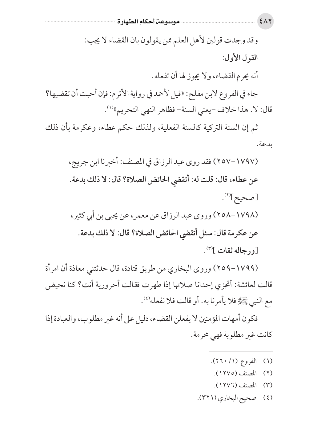 (١٧٩٩ - ٢٥٩) وروى البخاري من طريق قتادة، قال حدثتني معاذة أن امرأة قالت لعائشة: أتجزي إحدانا صلاتها إذا طهرت فقالت أحرورية أنت؟ كنا نحيض مع النبي صلى الله عليه وسلم فلا يأمرنا به. أو قالت فلا نفعله (¬٤).