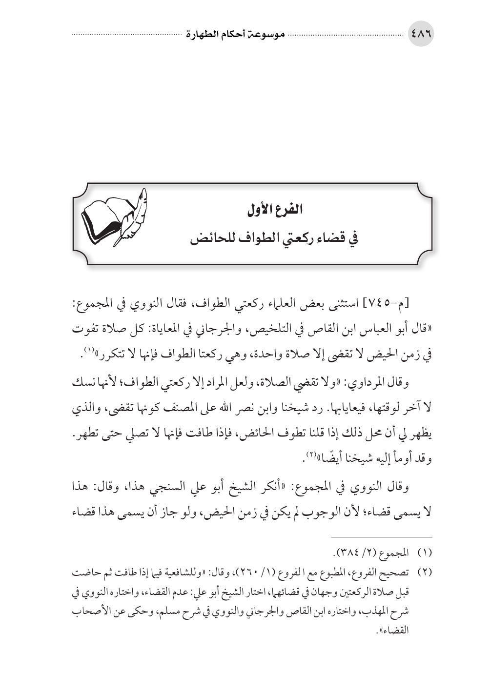 (¬٢) تصحيح الفروع، المطبوع مع الفروع (١/ ٢٦٠)، وقال: «وللشافعية فيما إذا طافت ثم حاضت قبل صلاة الركعتين وجهان في قضائهما، اختار الشيخ أبو علي: عدم القضاء، واختاره النووي في شرح المهذب، واختاره ابن القاص والجرجاني والنووي في شرح مسلم، وحكى عن الأصحاب القضاء».