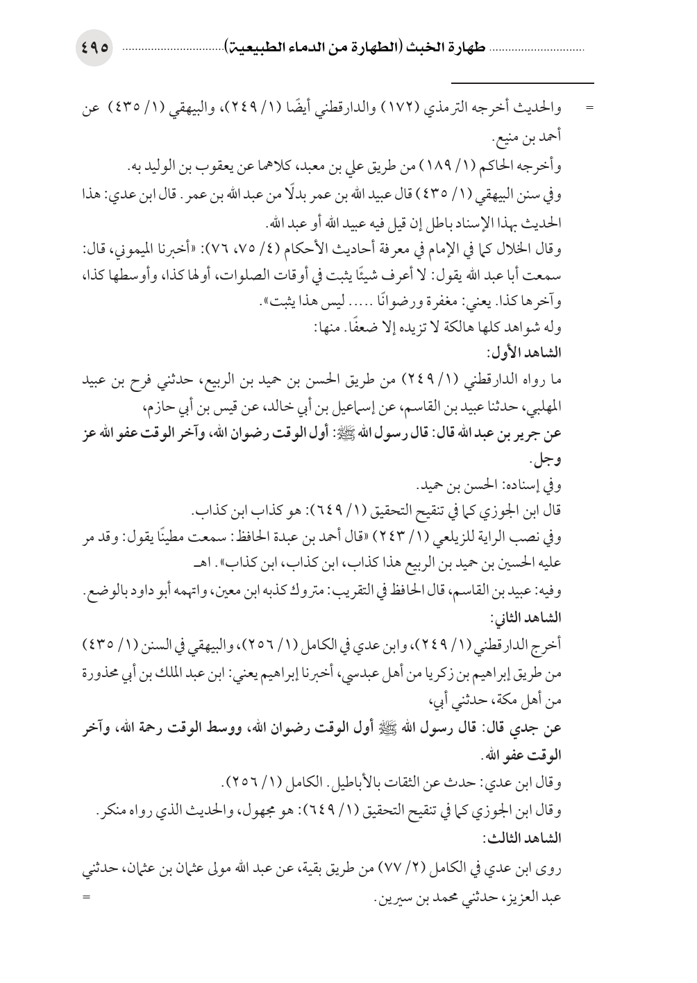 وفي سنن البيهقي (١/ ٤٣٥) قال عبيد الله بن عمر بدلًا من عبد الله بن عمر. قال ابن عدي: هذا الحديث بهذا الإسناد باطل إن قيل فيه عبيد الله أو عبد الله.