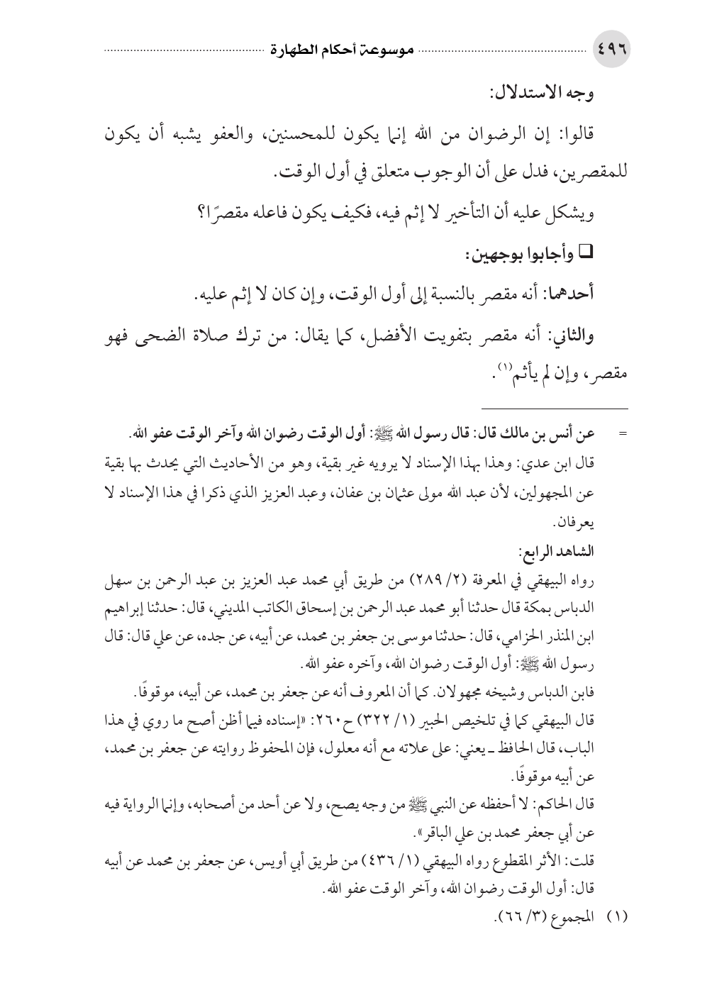 قلت: الأثر المقطوع رواه البيهقي (١/ ٤٣٦) من طريق أبي أويس، عن جعفر بن محمد عن أبيه قال: أول الوقت رضوان الله، وآخر الوقت عفو الله.