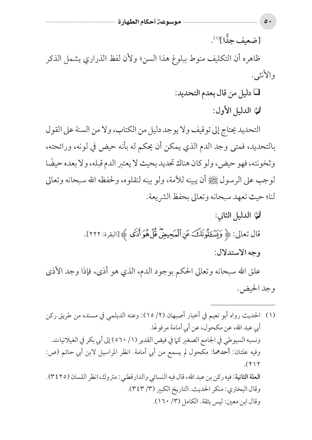 التحديد يحتاج إلى توقيف ولا يوجد دليل من الكتاب، ولا من السنة على القول بالتحديد، فمتى وجد الدم الذي يمكن أن يحكم له بأنه حيض في لونه، ورائحته، وثخونته، فهو حيض، ولو كان هناك تحديد بحيث لا يعتبر الدم قبله، ولا بعده حيضًا لوجب على الرسول صلى الله عليه وسلم أن يبينه للأمة، ولو بينه لنقلوه، ولحفظه الله سبحانه وتعالى لنا؛ حيث تعهد سبحانه وتعالى بحفظ الشريعة.