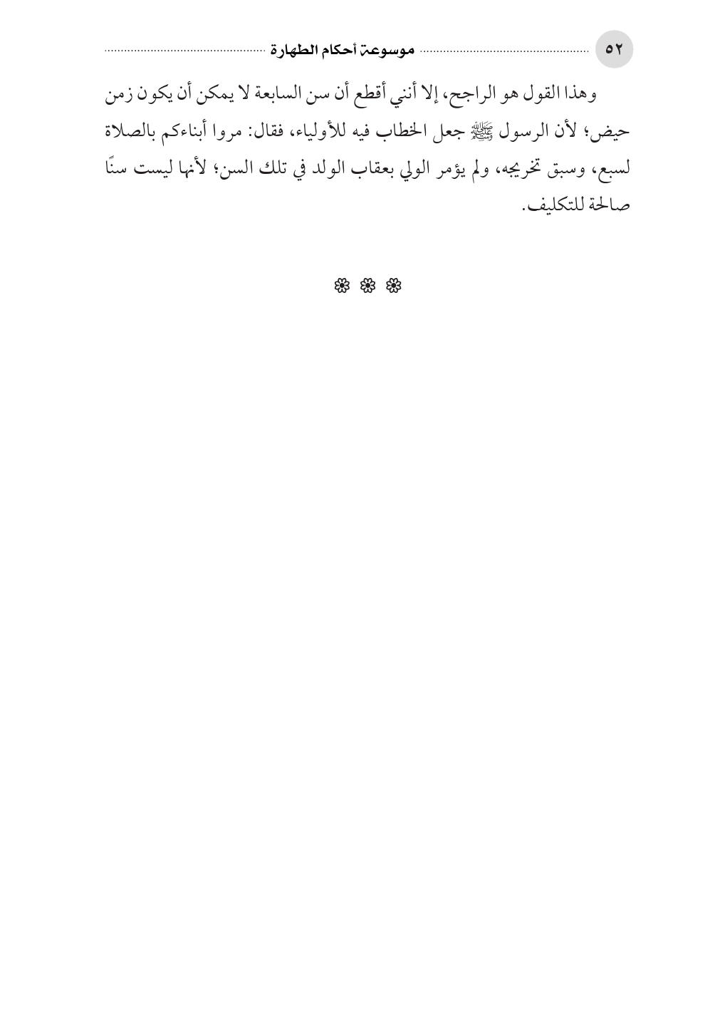 وهذا القول هو الراجح، إلا أنني أقطع أن سن السابعة لا يمكن أن يكون زمن حيض؛ لأن الرسول صلى الله عليه وسلم جعل الخطاب فيه للأولياء، فقال: مروا أبناءكم بالصلاة لسبع، وسبق تخريجه، ولم يؤمر الولي بعقاب الولد في تلك السن؛ لأنها ليست سنًا صالحة للتكليف.