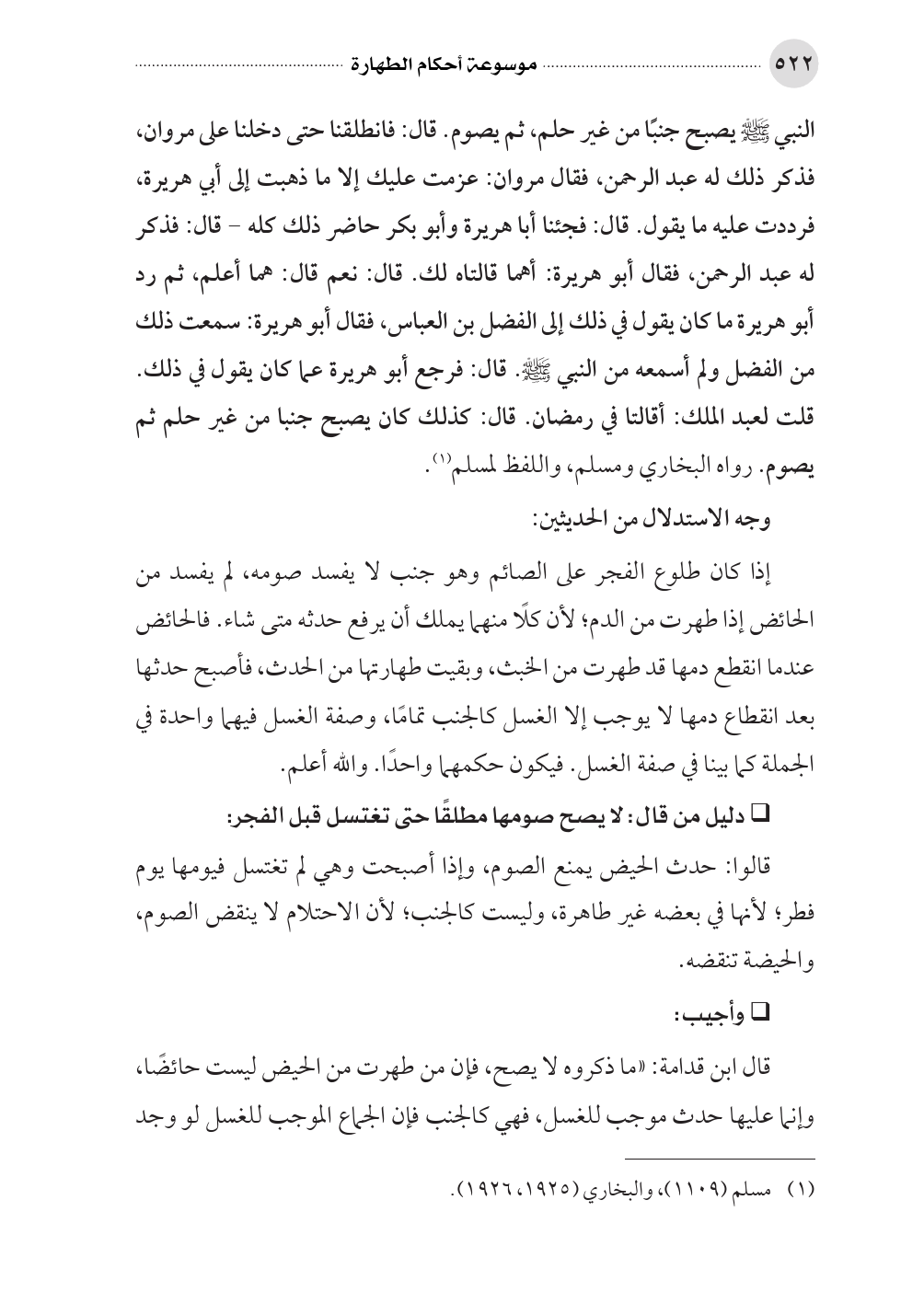 أبو هريرة ما كان يقول في ذلك إلى الفضل بن العباس، فقال أبو هريرة: سمعت ذلك من الفضل ولم أسمعه من النبي صلى الله عليه وسلم. قال: فرجع أبو هريرة عما كان يقول في ذلك. قلت لعبد الملك: أقالتا في رمضان. قال: كذلك كان يصبح جنبا من غير حلم ثم يصوم. رواه البخاري ومسلم، واللفظ لمسلم (¬١).