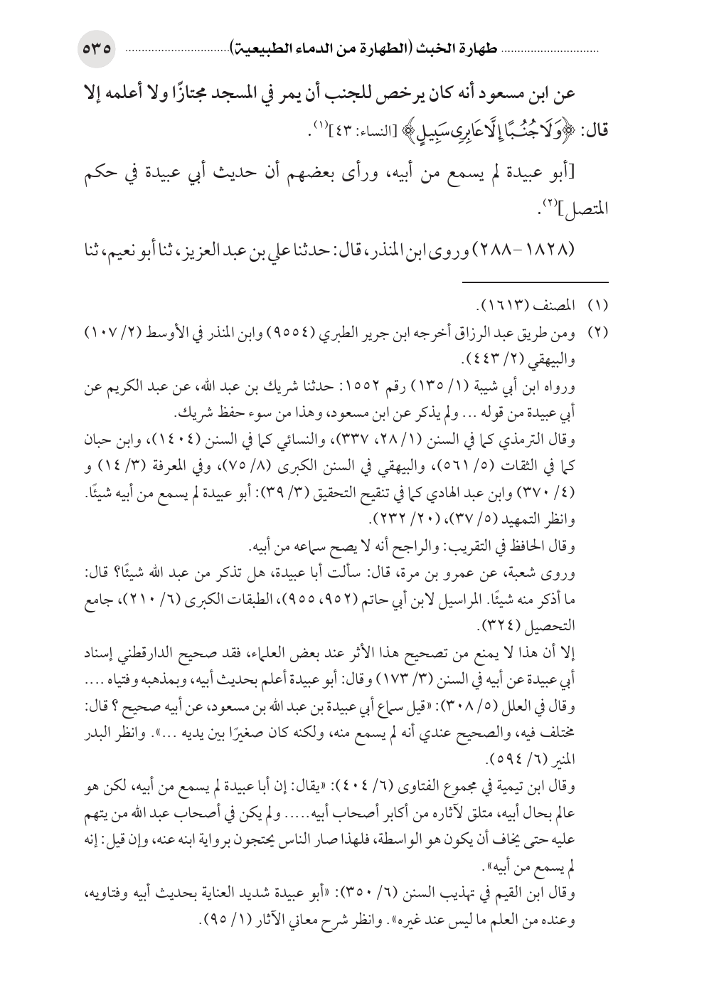 عن ابن مسعود أنه كان يرخص للجنب أن يمر في المسجد مجتازًا ولا أعلمه إلا قال: (وَلا جُنُباً إِلَاّ عَابِرِي سَبِيلٍ) [النساء: ٤٣] (¬١).